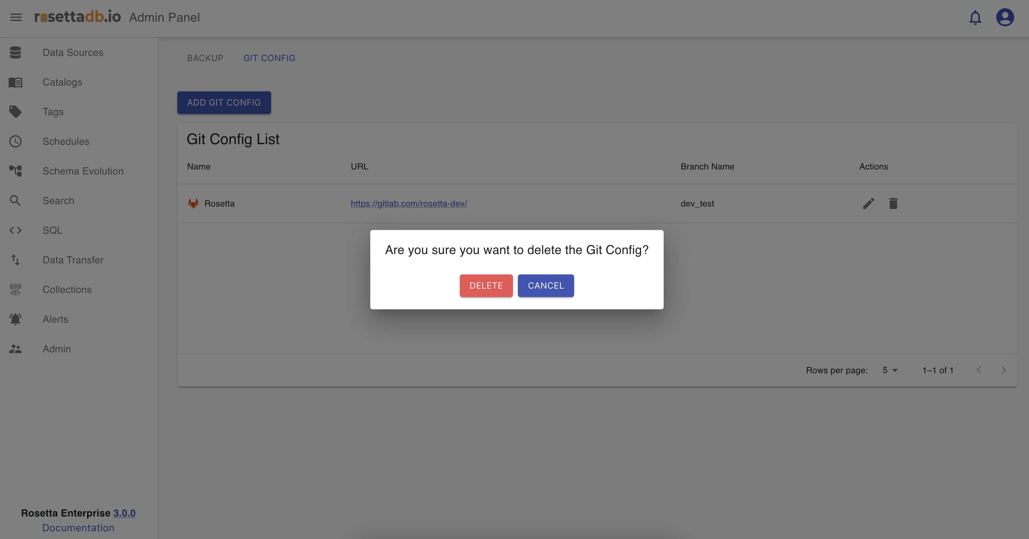 Now that one git is configured, on Git Config tab the user can see a list of the git configurations and a button Add Git Config that redirects to the Git Configuration screen for creating a new configuration. The configuration can be edited and deleted.