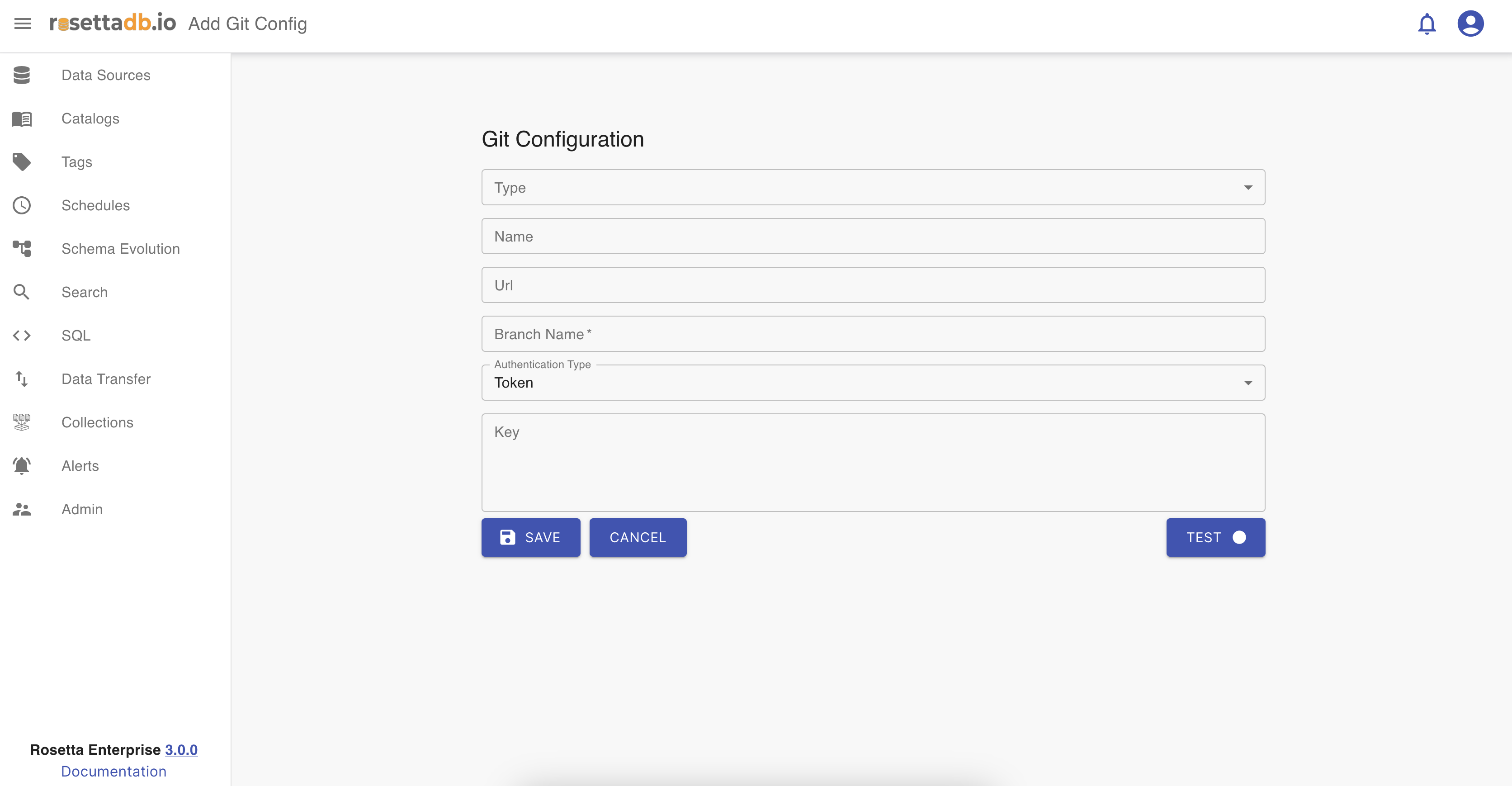 In Git Configuration the user must choose a type of the git such as GitHub, Gitlab, or Bitbucket, fill the name that should be unique, add the url, insert the branch name and provide the authentication key.