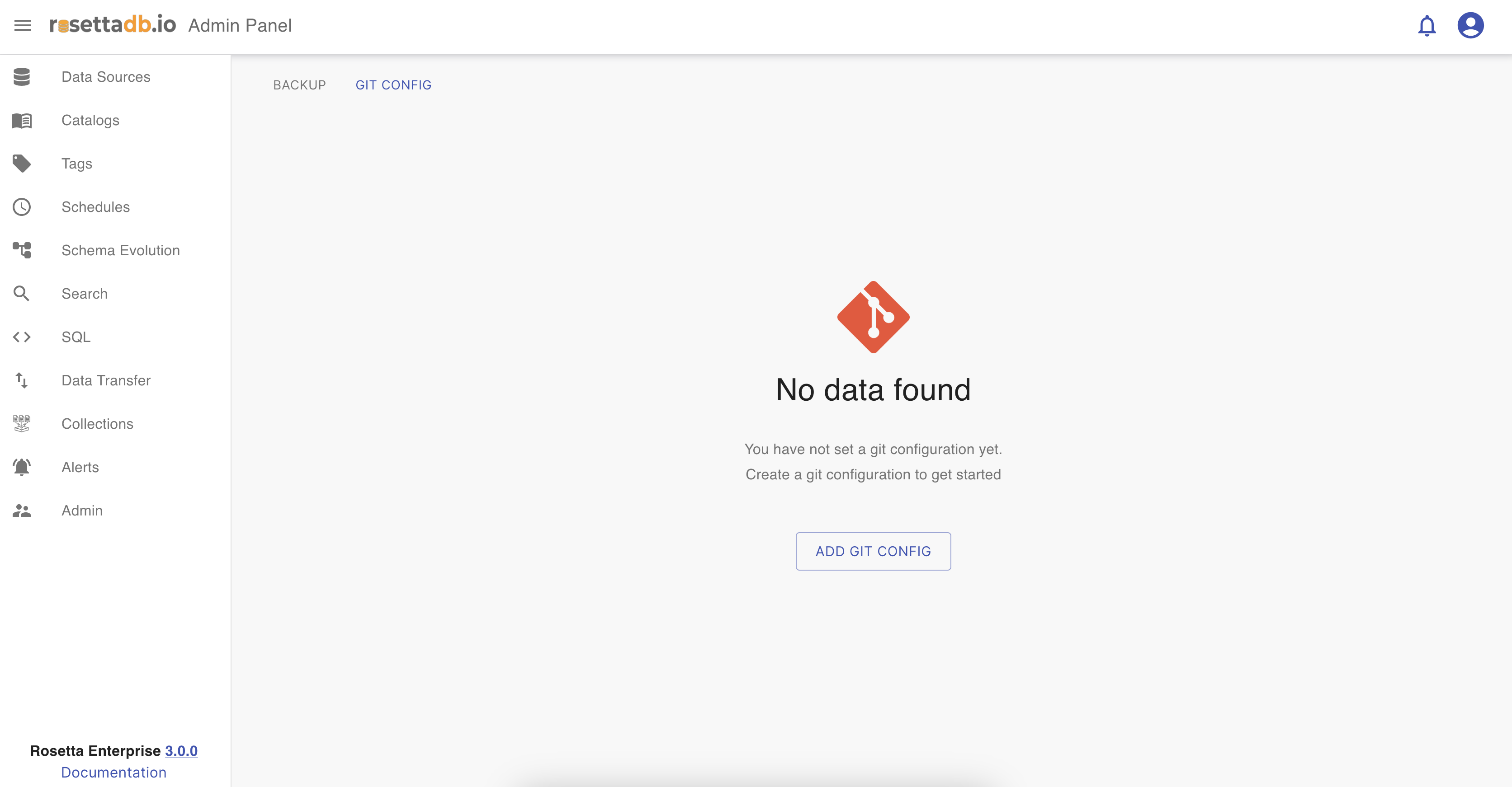 Git configuration is needed if the user wants to deploy the collection changes made in the project. In order to use the git feature the user must create one by choosing on Git Config tab and then click on Add Git Config button.