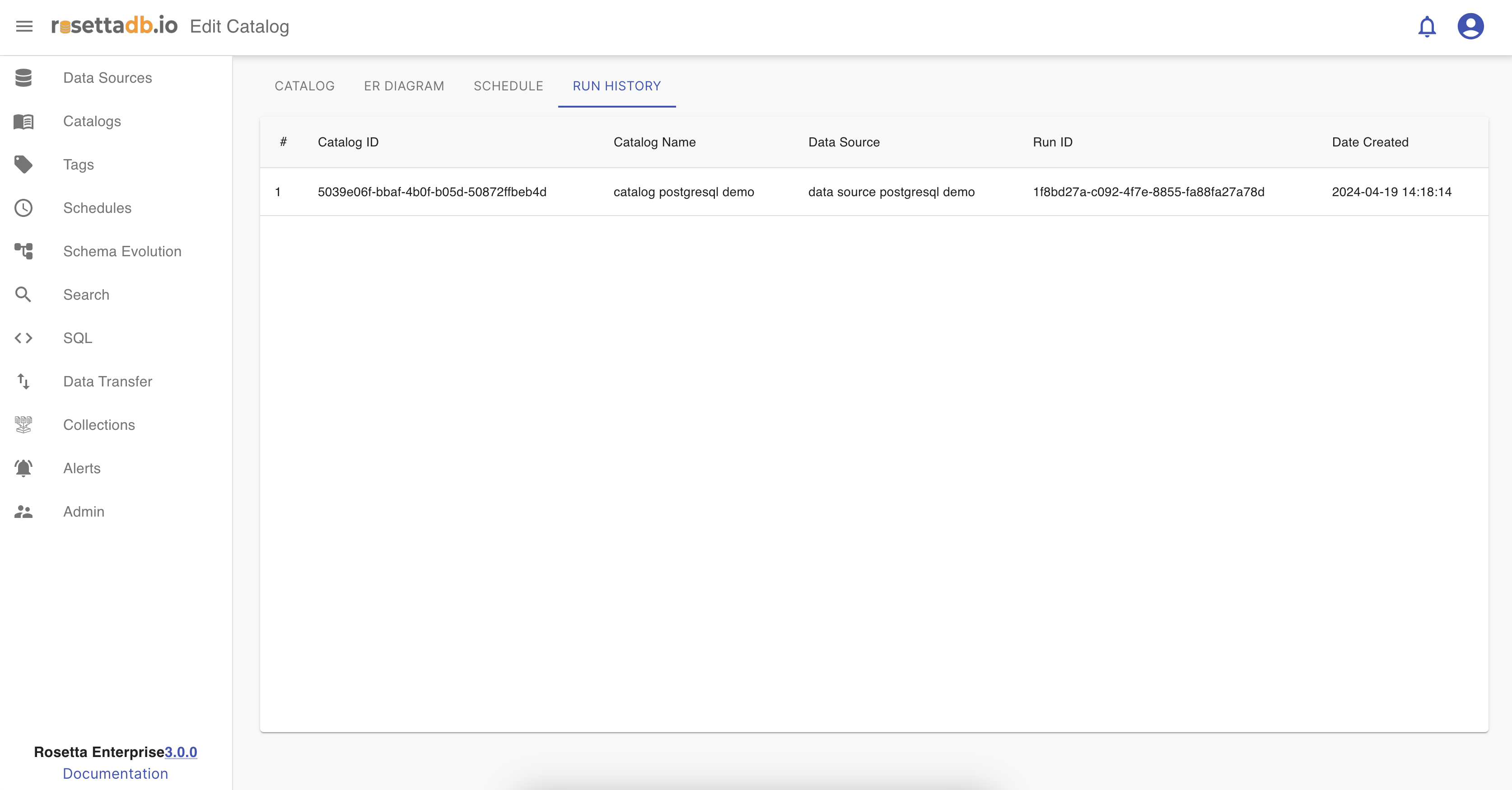 Run History tab lists all the runs of the catalog.