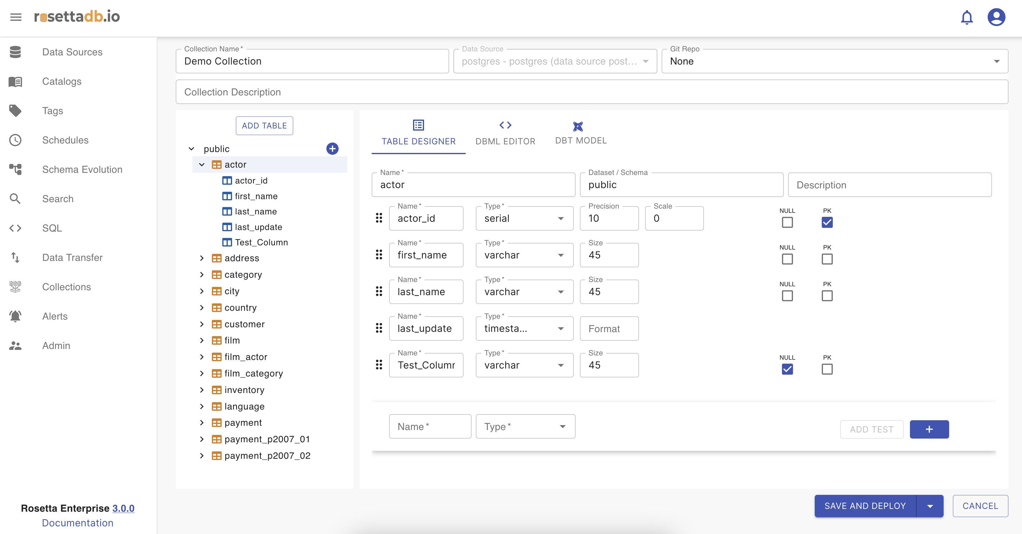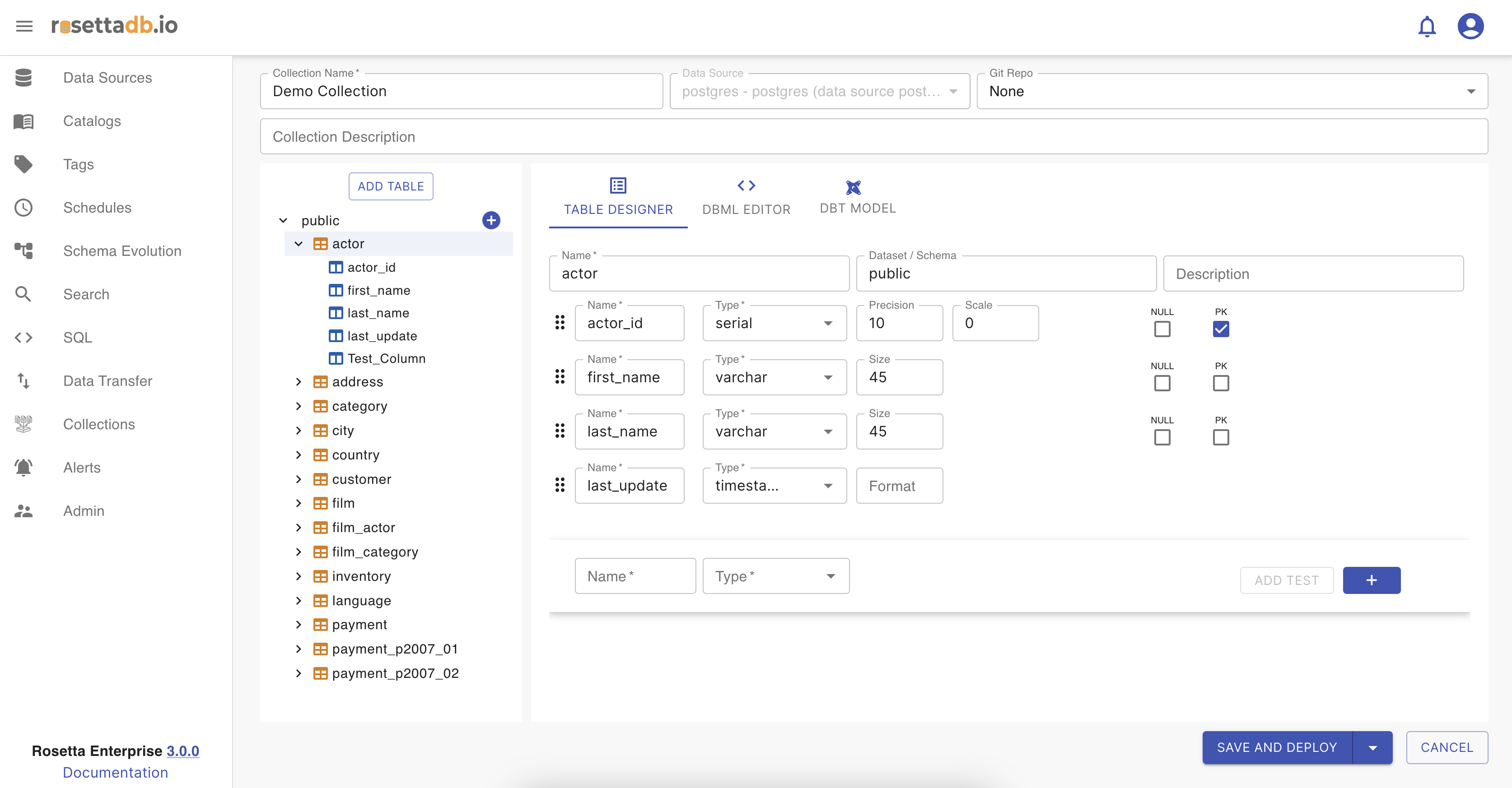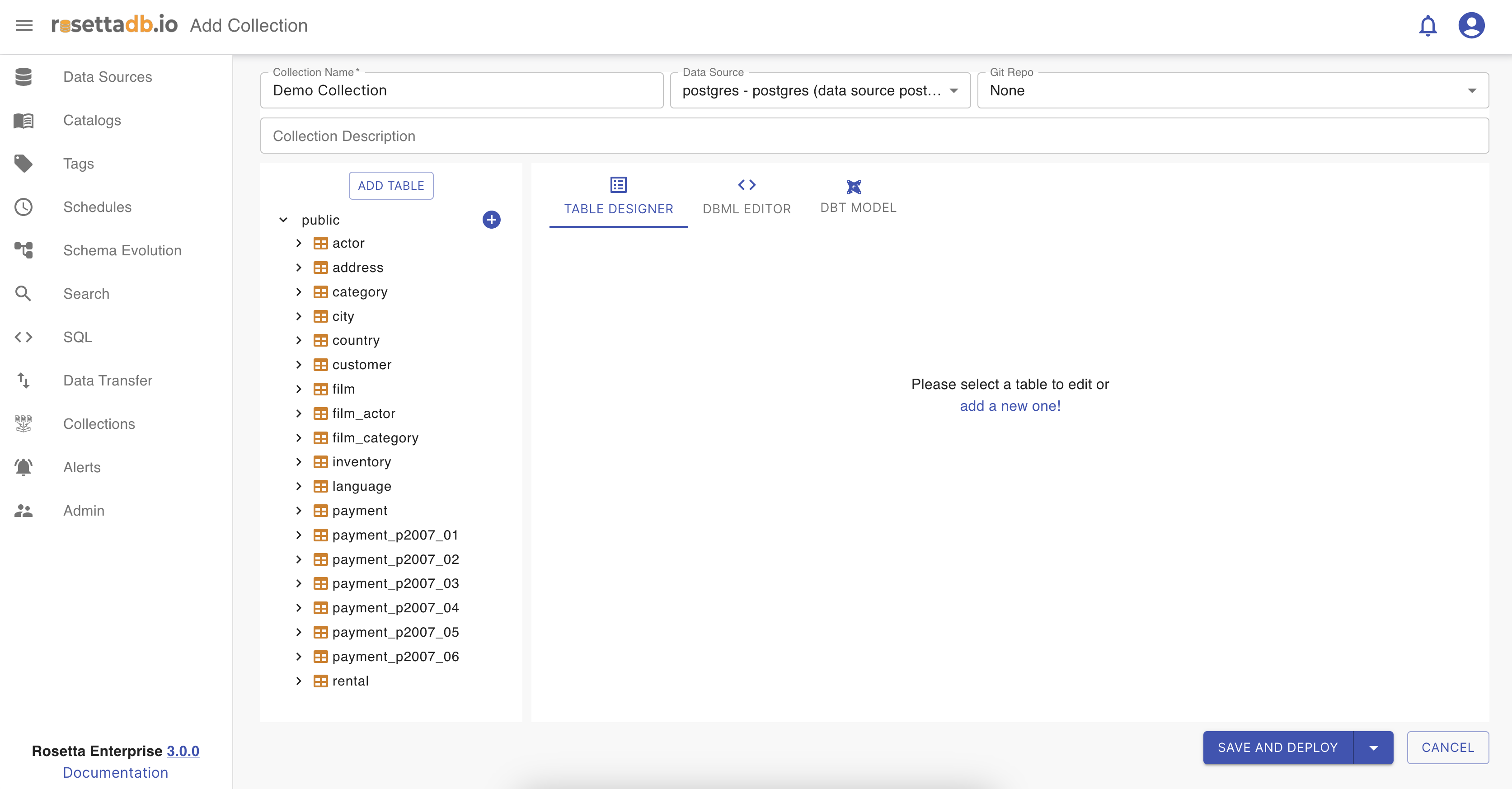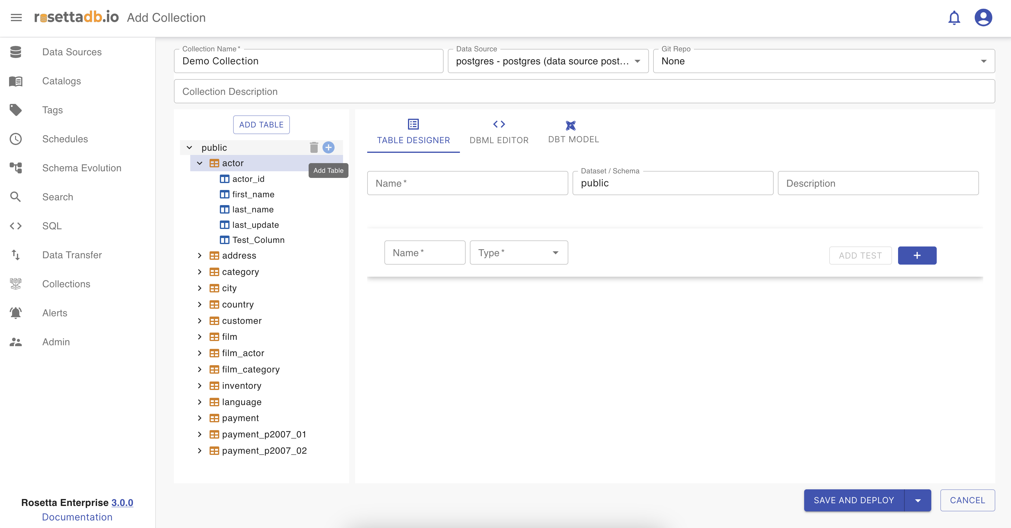 Collection is the category where the user can create a collection based on the existing data sources, or can create a new one from scratch. The data of the data source can be explored on table designer, it can change or also create completely new ones. The collection can be linked to a git repo.