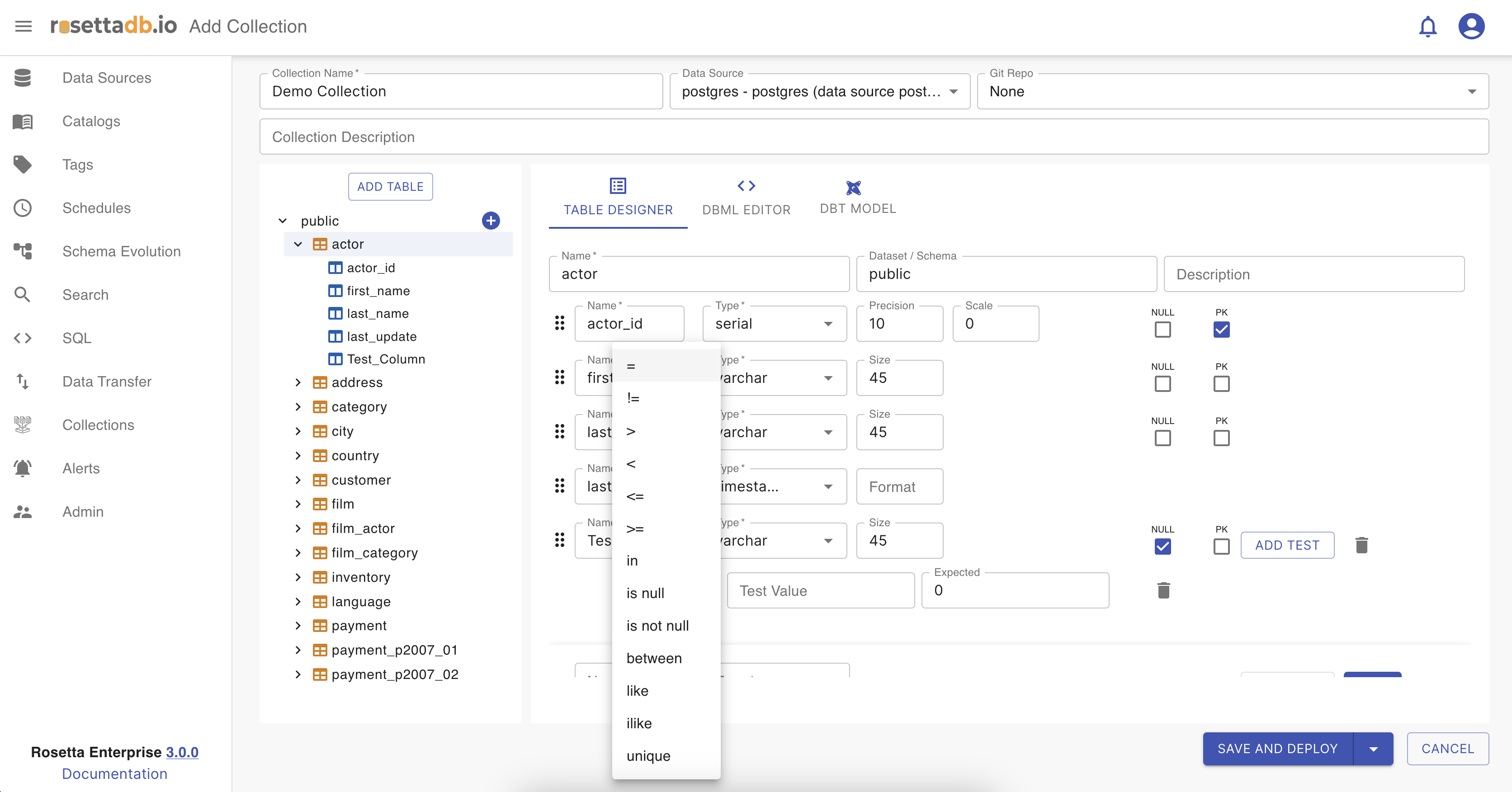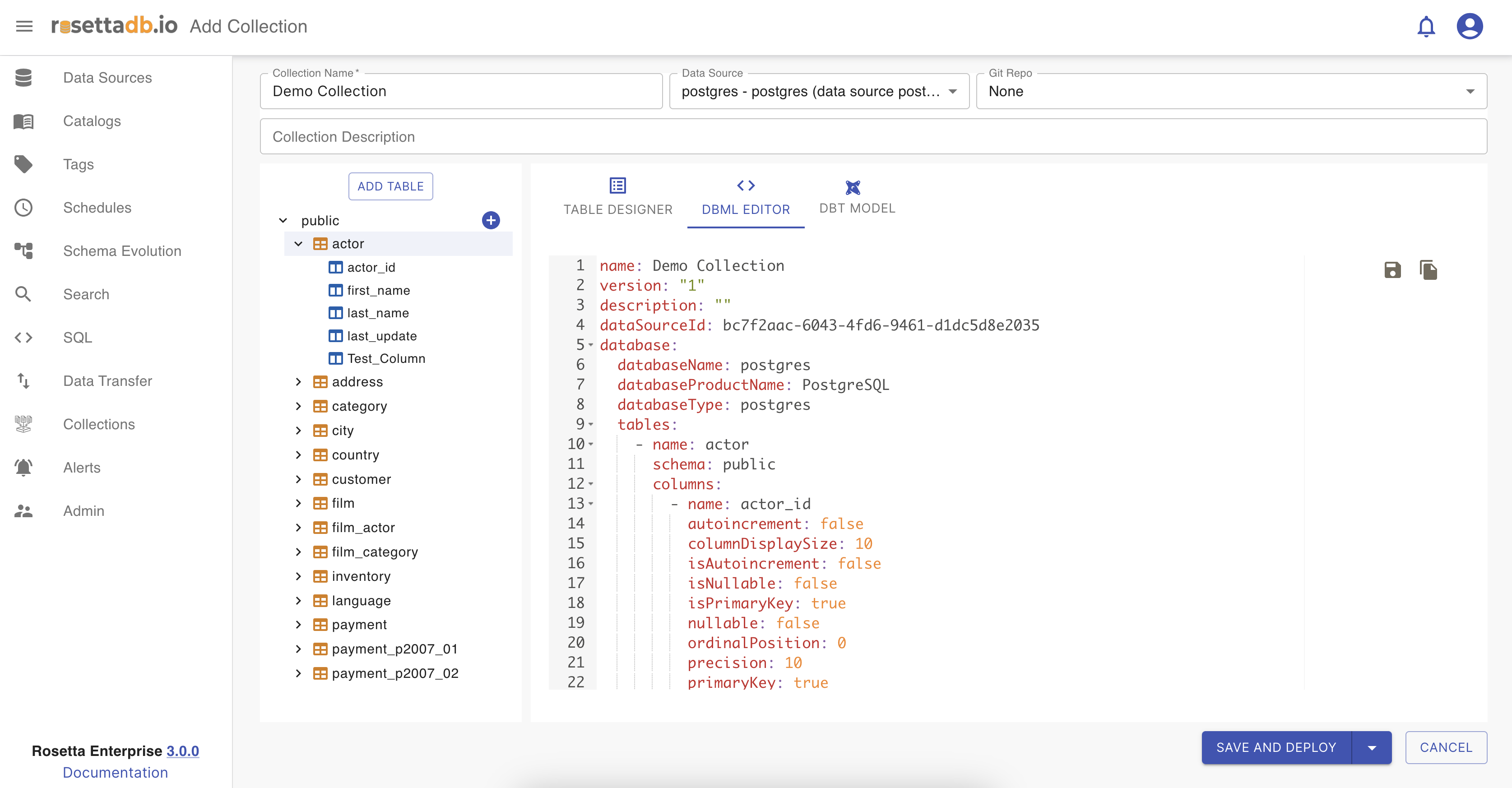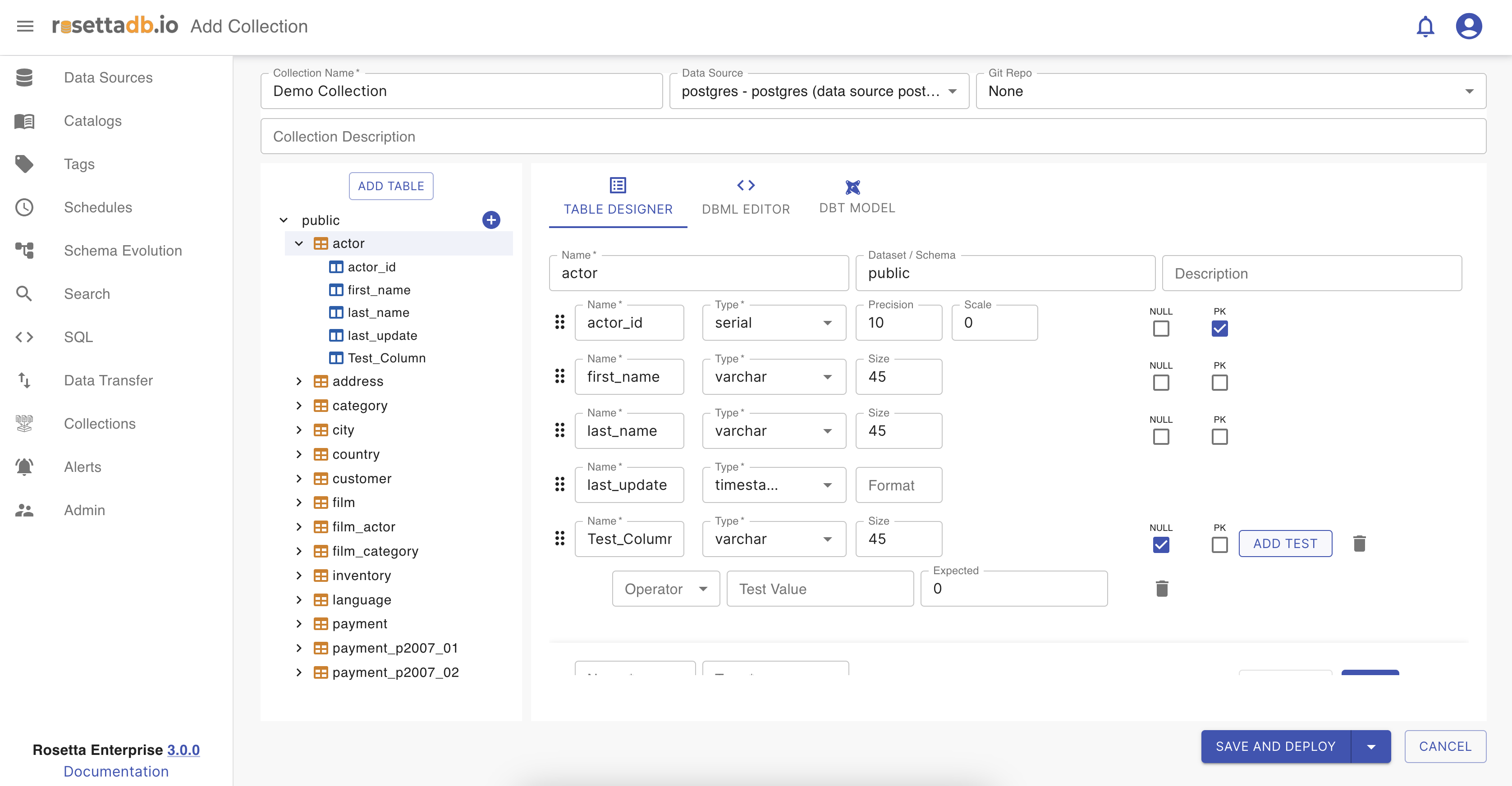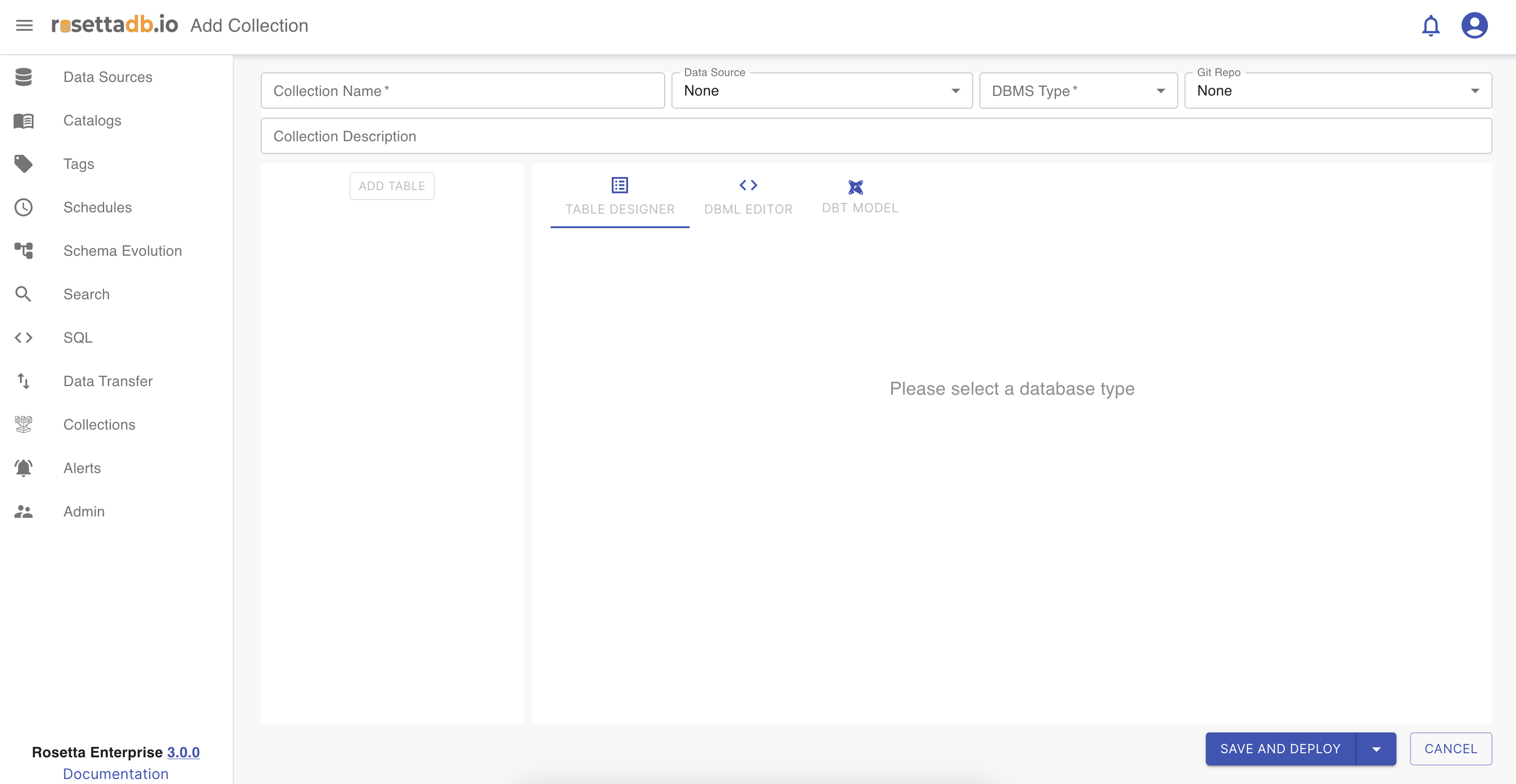 Collection is the category where the user can create a collection based on the existing data sources, or can create a new one from scratch. The data of the data source can be explored on table designer, it can change or also create completely new ones. The collection can be linked to a git repo.