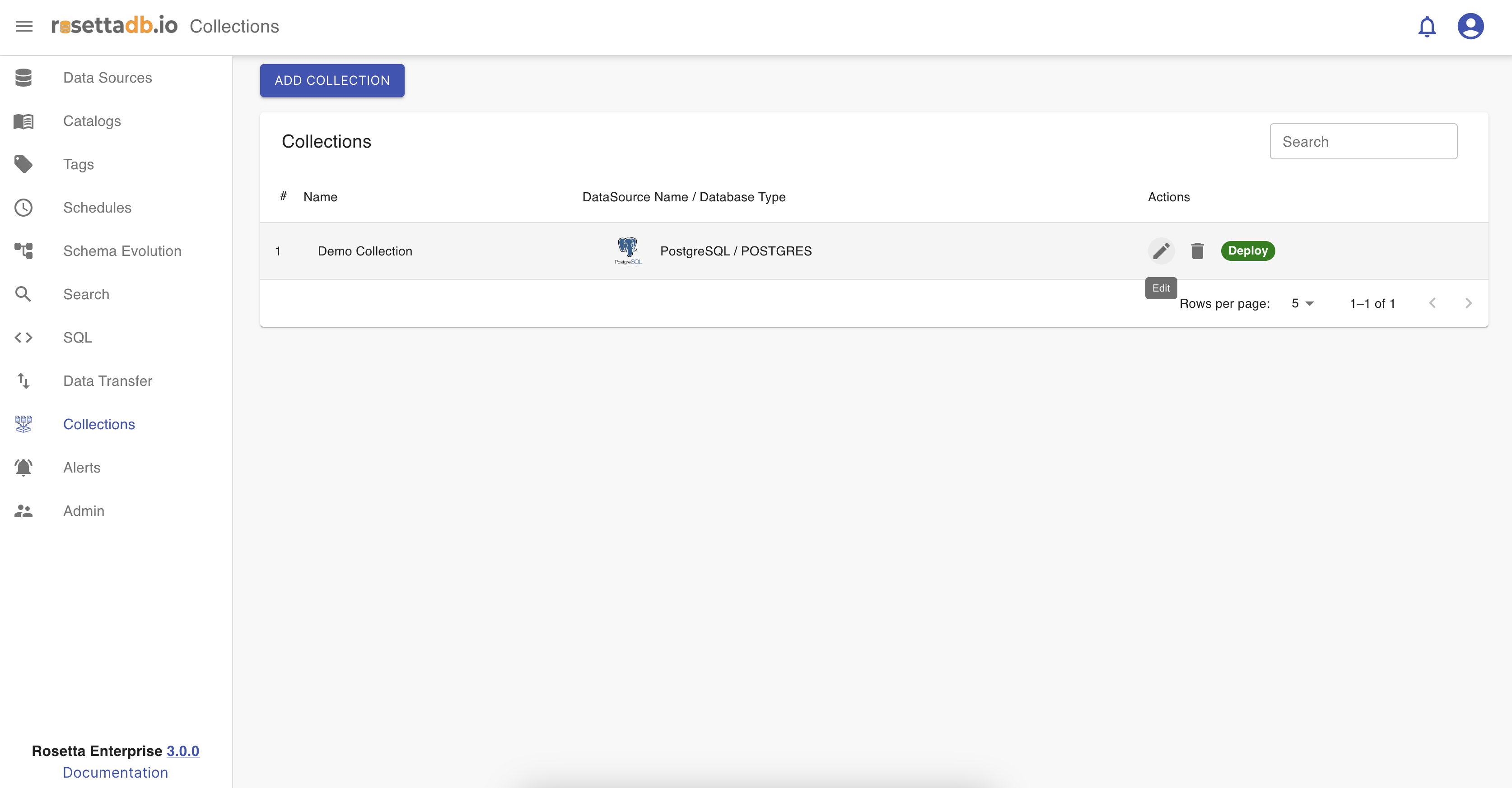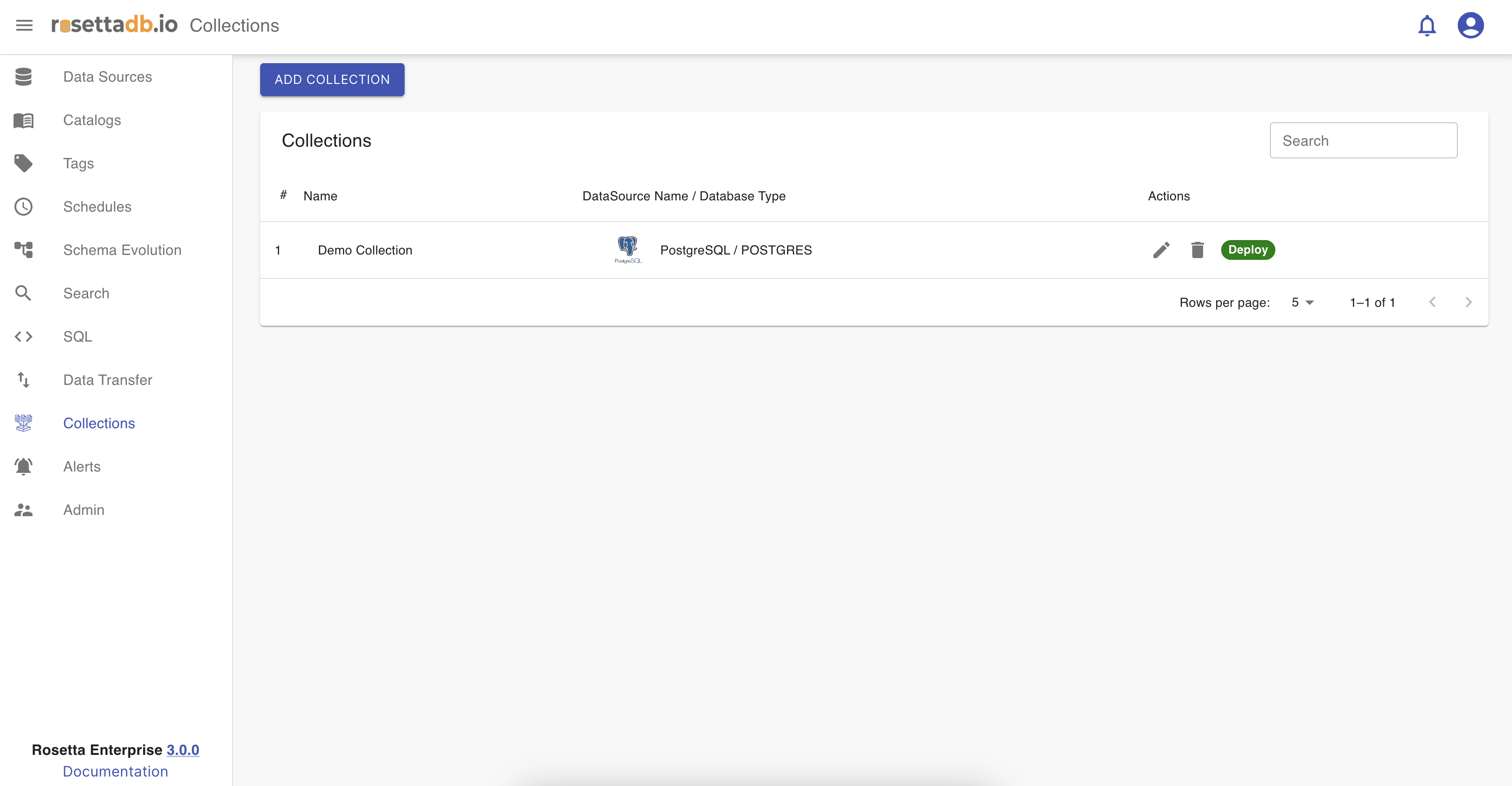 Now that a collection is configured, on Collection tab the user can see a list of the collections and a button Add Collection that redirects to the Collections screen for creating a new one. The collection can be edited, deleted, deployed and searched.
