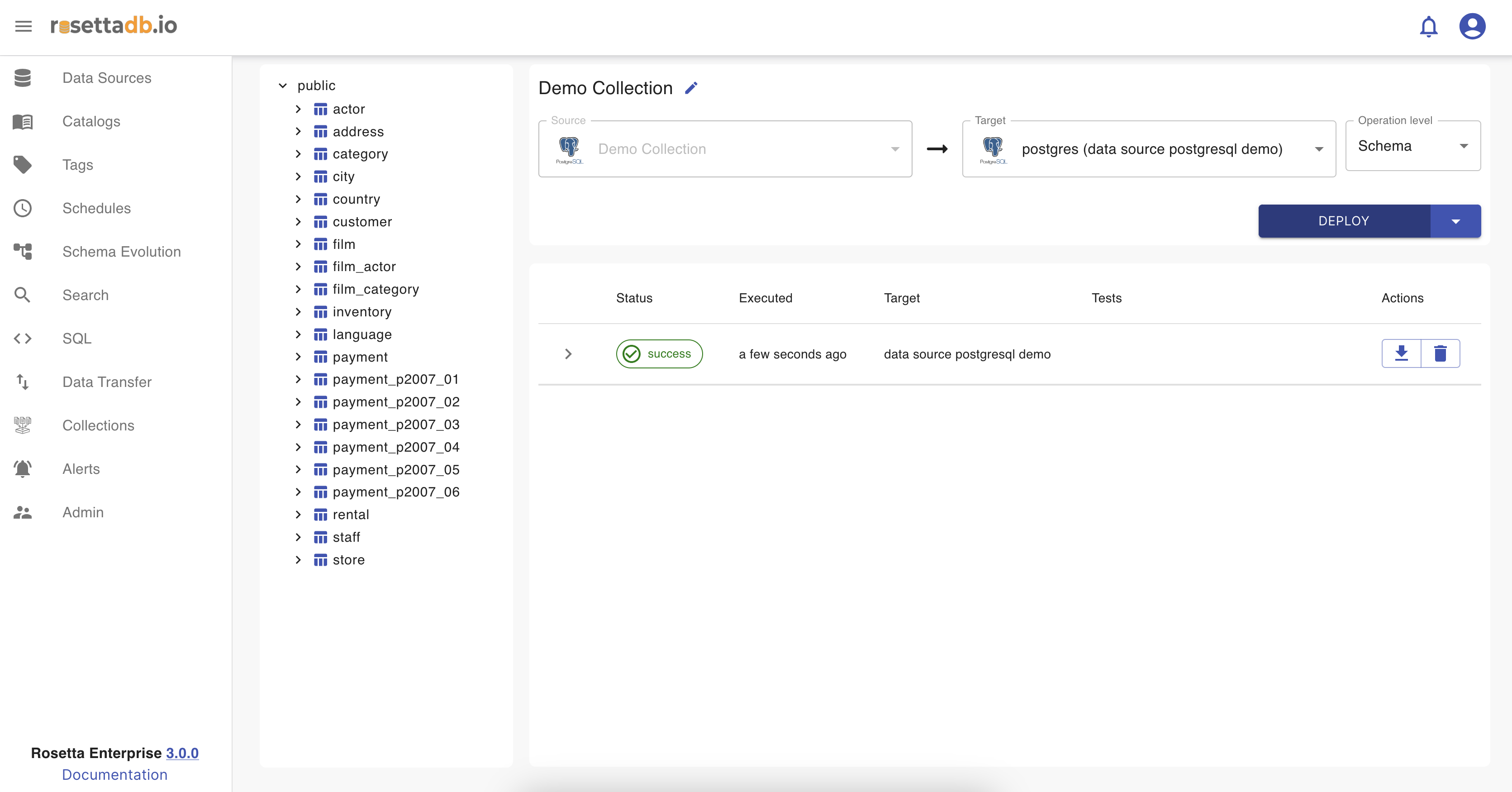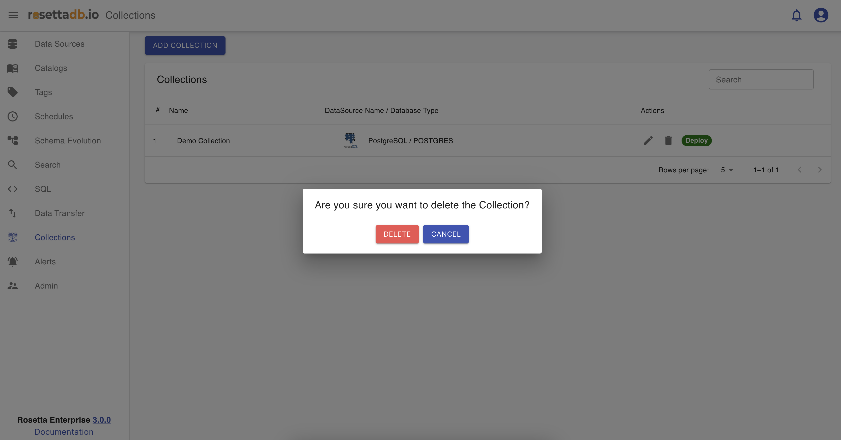 The collection that we created or updated can be deployed on a target DB. This is done by clicking on the Deploy button from the list.