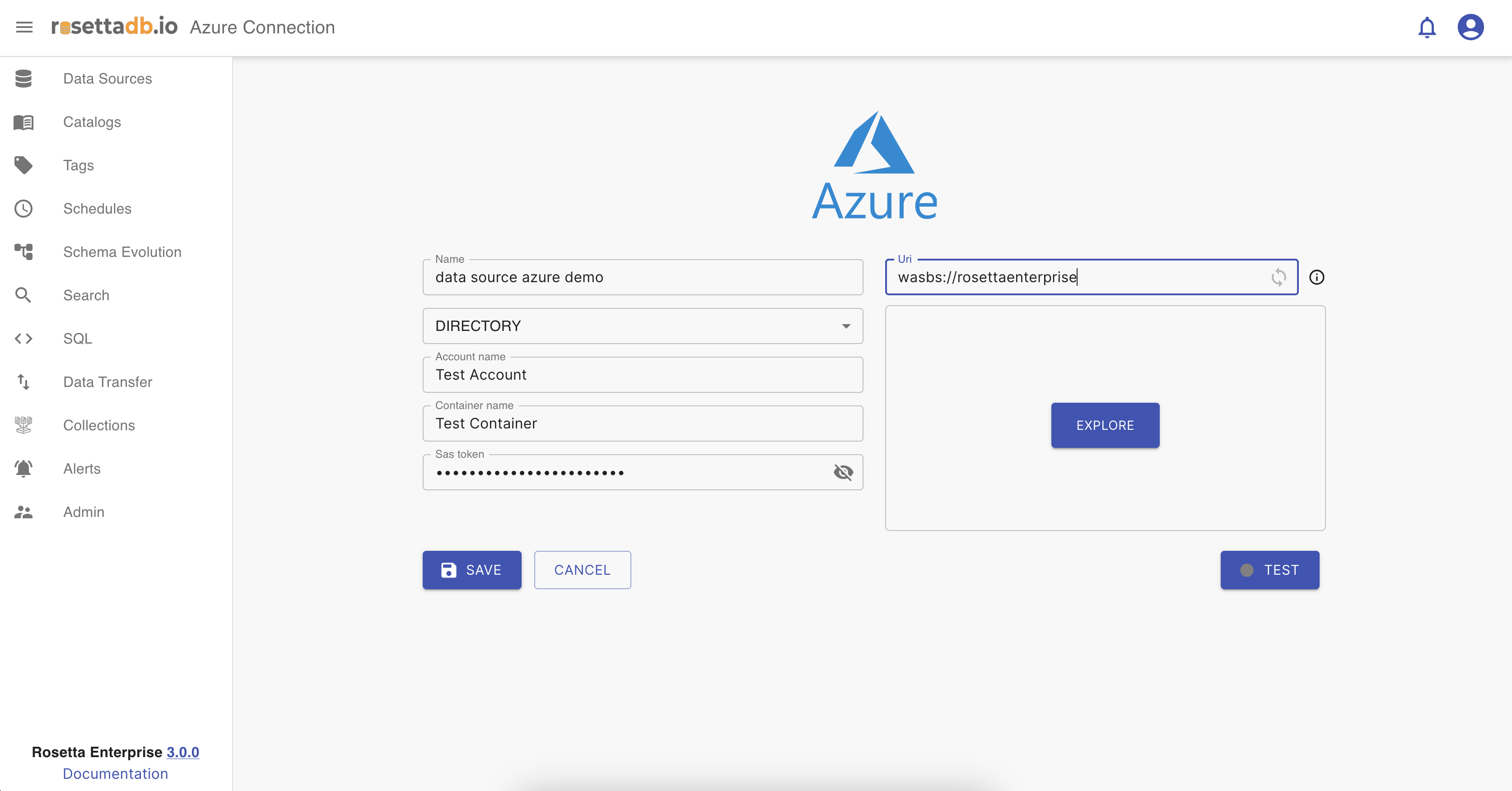 If the user chooses Microsoft Azure connection type the user needs to fill in a name, choose a schema type of the file, CSV, Avro, or parquet, provide the Account name, Container name, and SAS token, and fill in the URI of the file starting with wasbs://. The user can explore what files are inside the bucket by clicking on Explore, even without filling in the URI. If it clicks on one of the files or directories of that bucket, the URI will be filled or rewritten automatically.