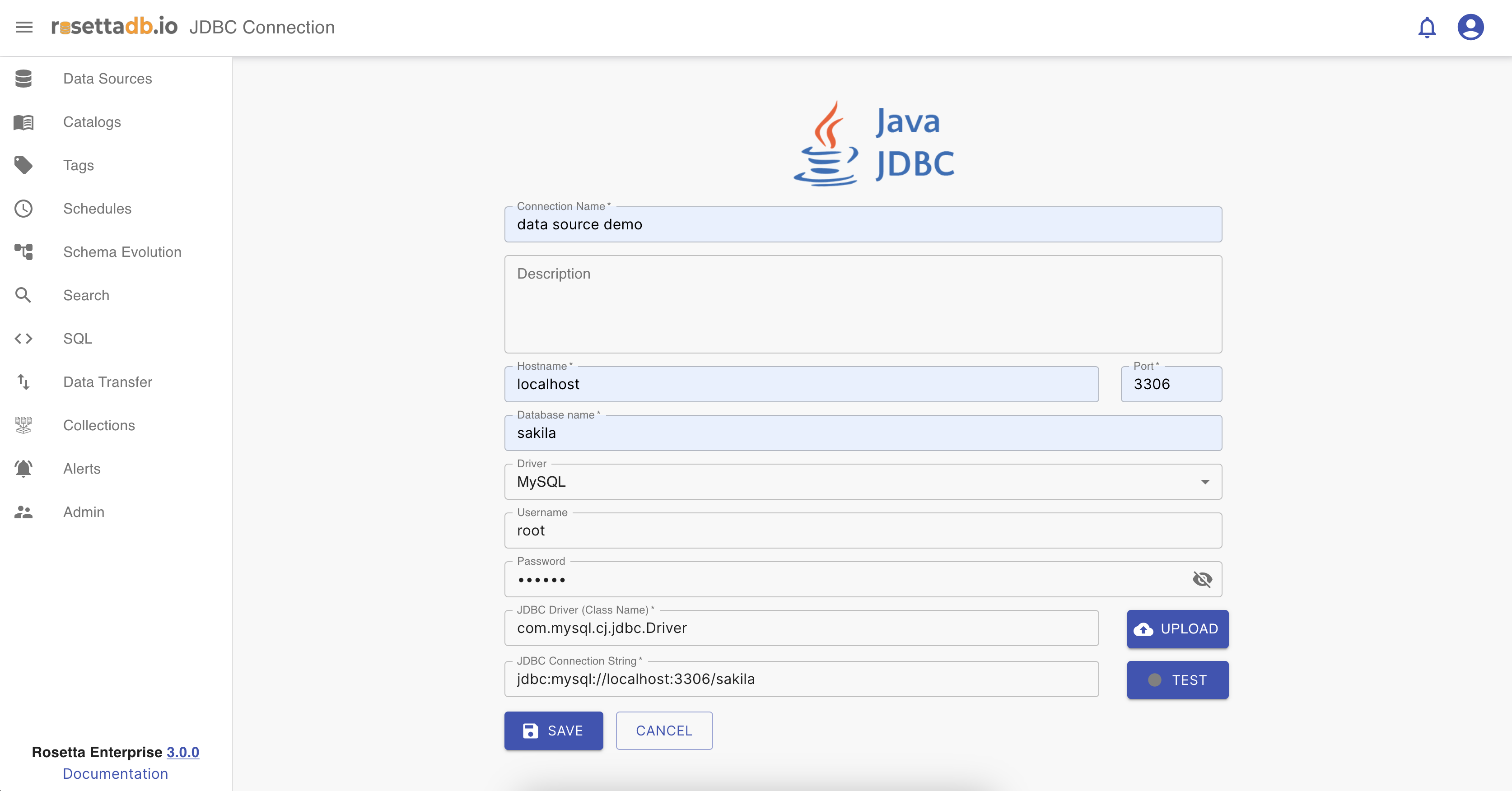 If the user chooses JDBC connection type, must fill in some fields such as a connection name that should be unique, a description, hostname, and port based on the DB server chosen from the dropdown list, and configured username and password for the data source, the JDBC driver should be uploaded and JDBC connection string should be given in a format jdbc:sqlserver://{host}[:{port}][databasename={database}].