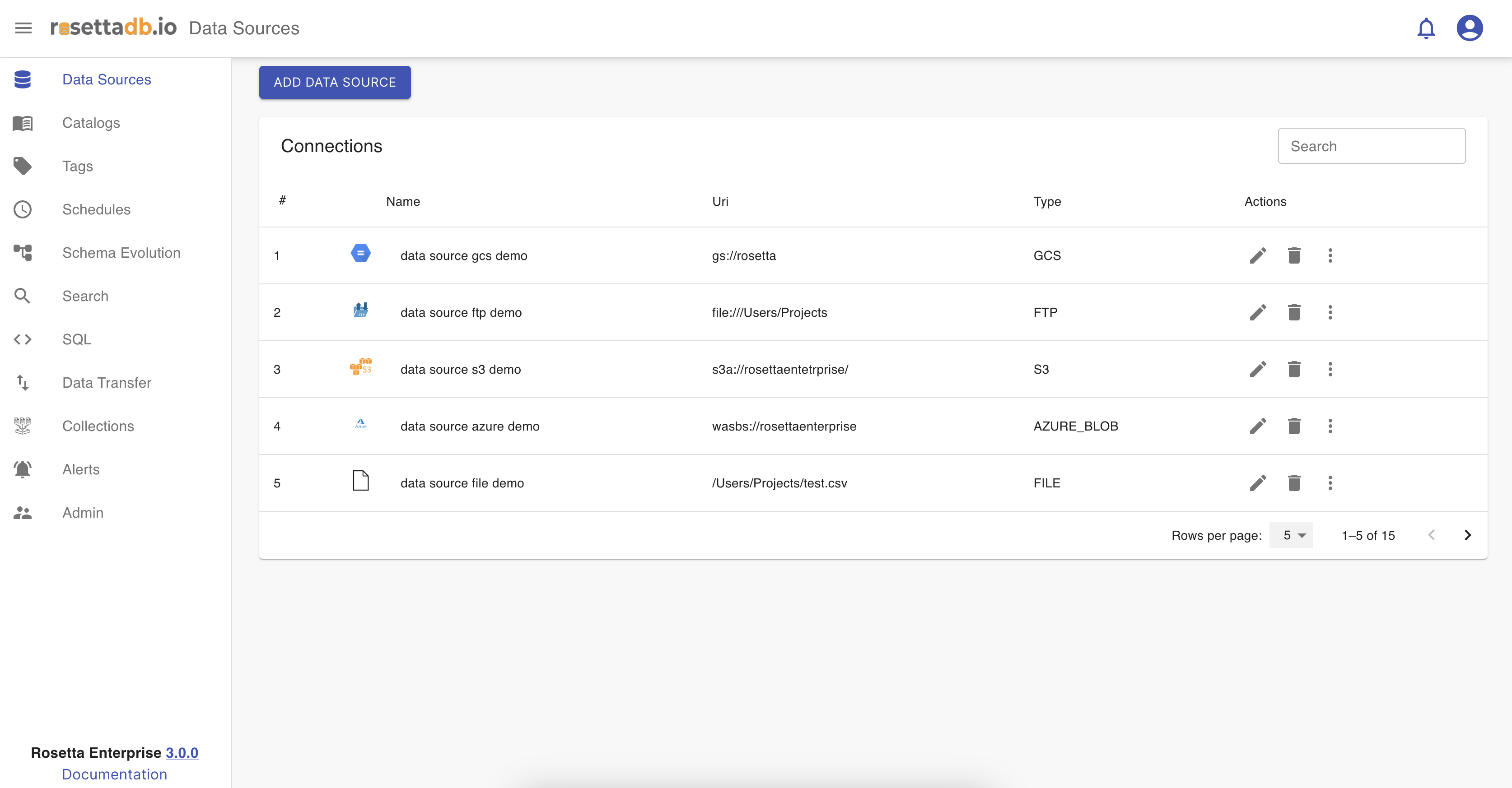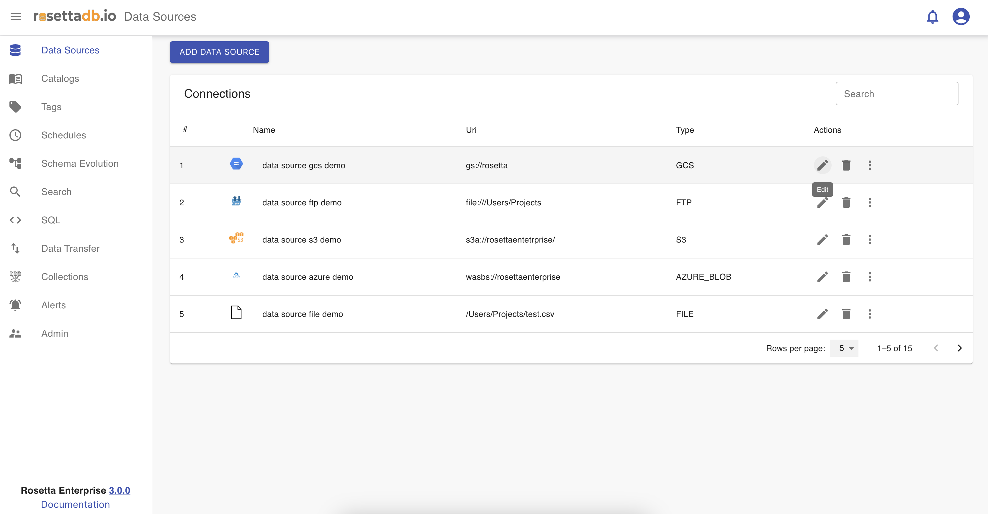 When the user clicks on the pen icon next to the data sources from the list they can edit some of the fields and save the changes.