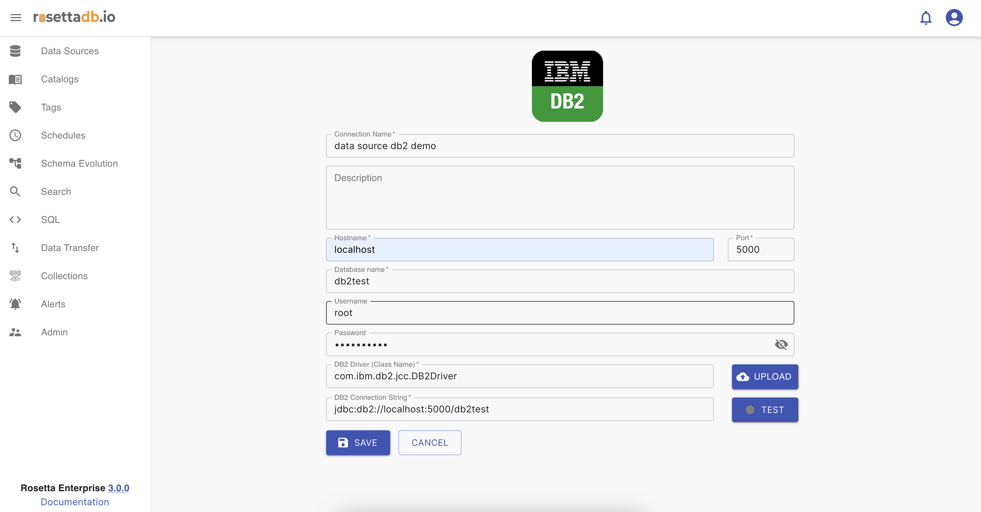 If the user chooses DB2 connection type, must fill in some fields such as a connection name that should be unique, a description, hostname, and port, configured username and password for the data source, the driver should be uploaded and the JDBC connection string should be given in a format jdbc:db2://${host}:${port}.