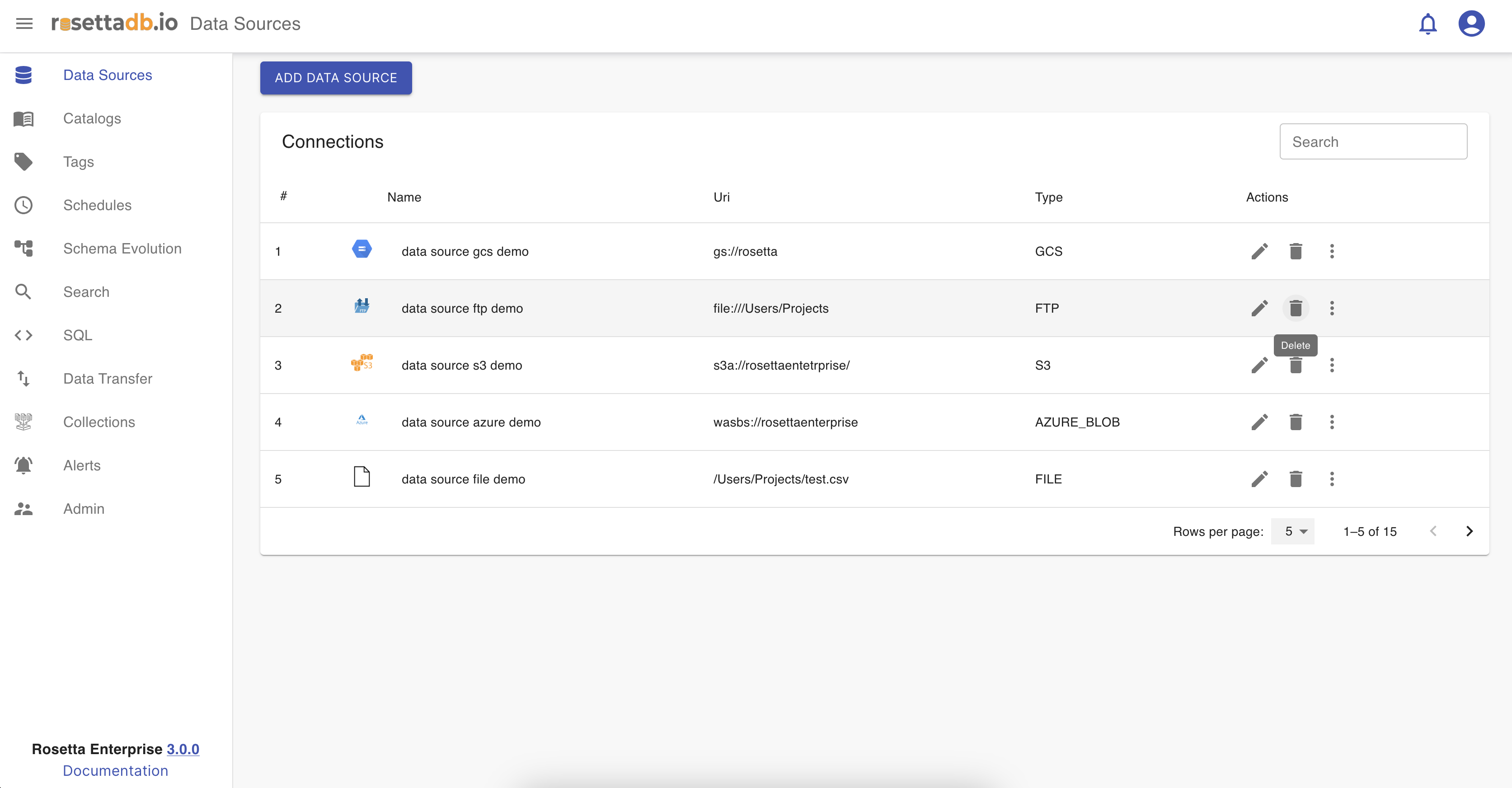 When the icon is clicked, a pop-up appears with a question if the user is sure about deleting the data source, and if yes the user clicks Delete and if not clicks Cancel.