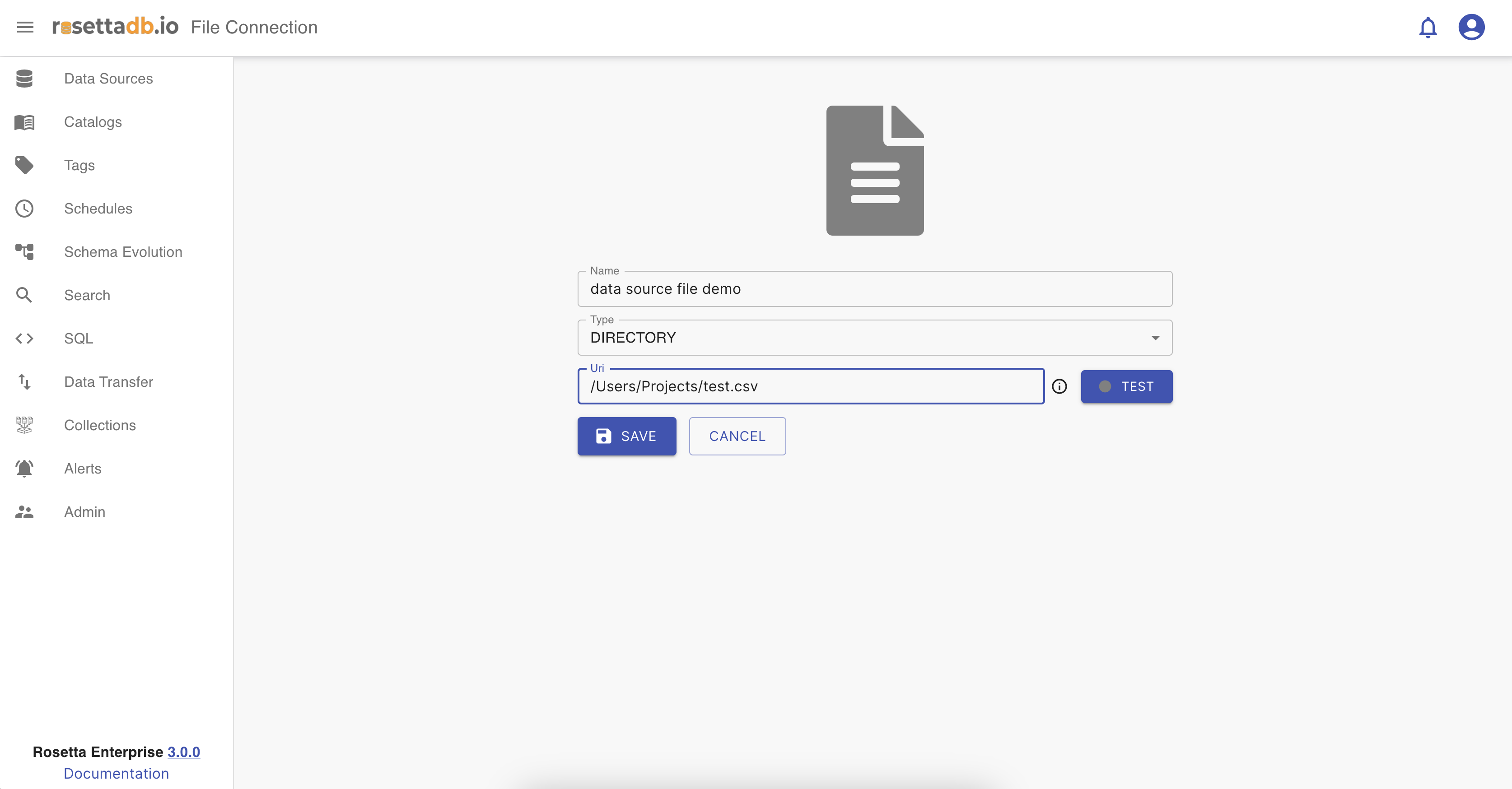 If the user chooses file connection type the user needs to fill in a name, choose a type of the file, CSV, Avro, or parquet, and fill in the URI of the file.