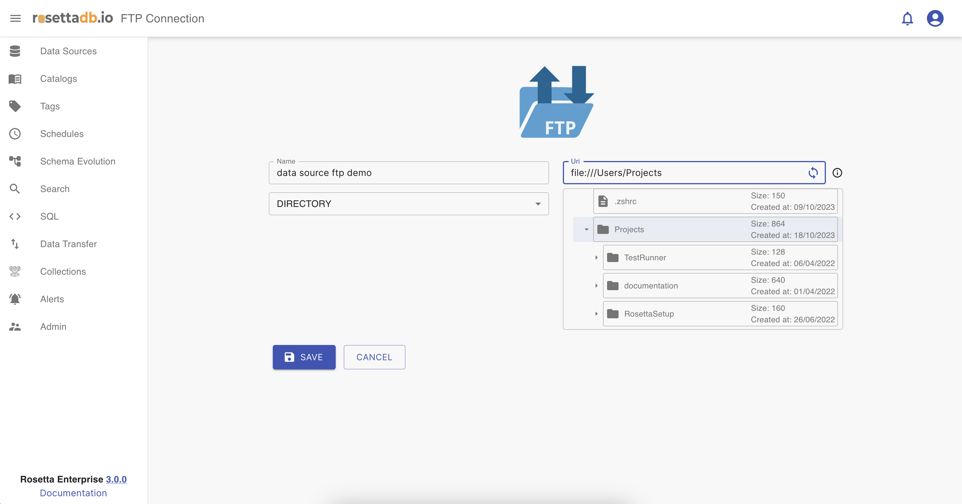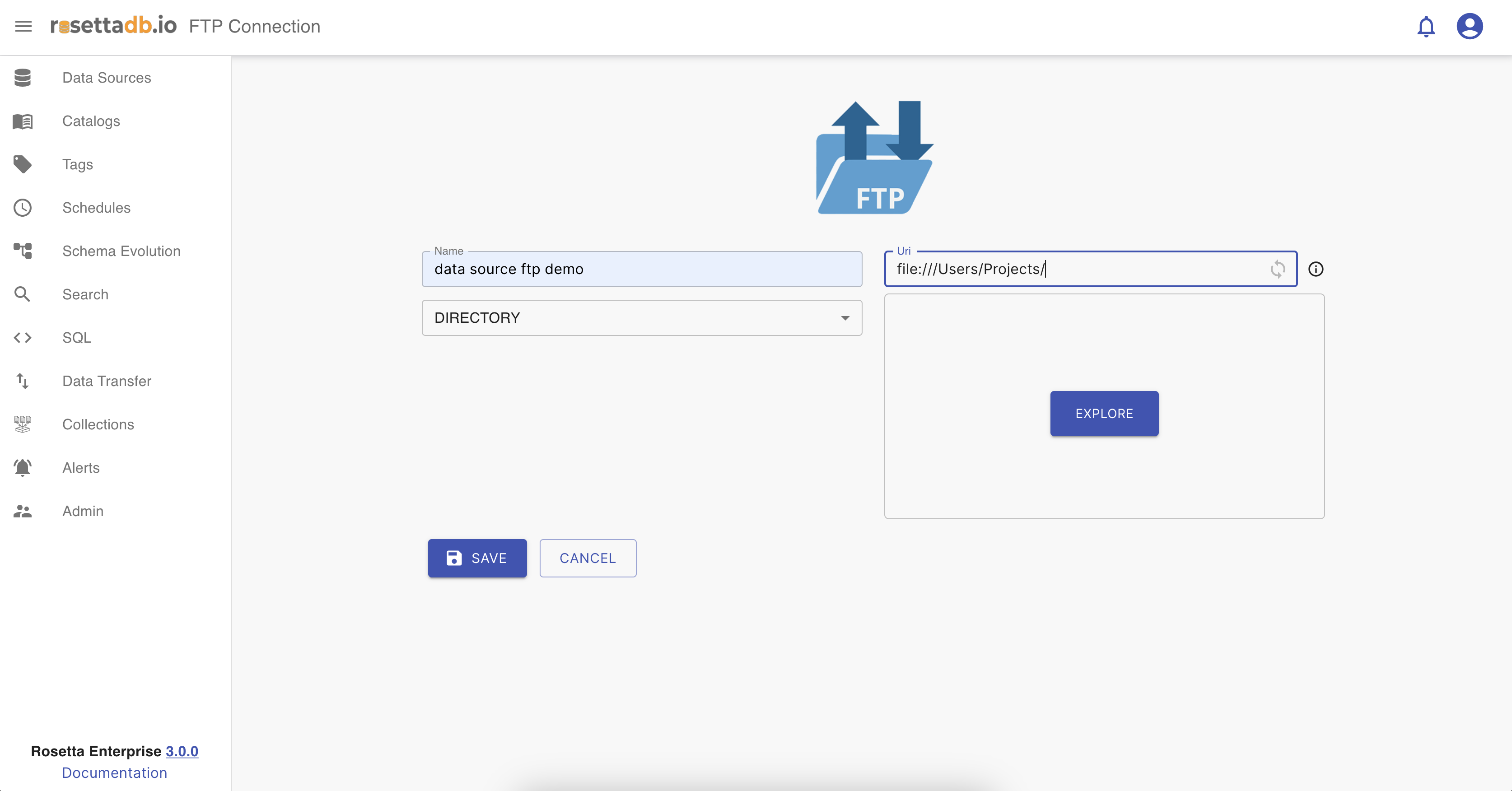 If the user chooses FTP connection type it needs to fill in a name, choose a type, a directory, CSV, Avro or parquet, and fill in the URI of the file starting with file://. In order to explore what files are inside the directory by clicking on Explore the user must specify the URI. If it clicks on one of the files of that directory, the URI will be rewritten automatically.