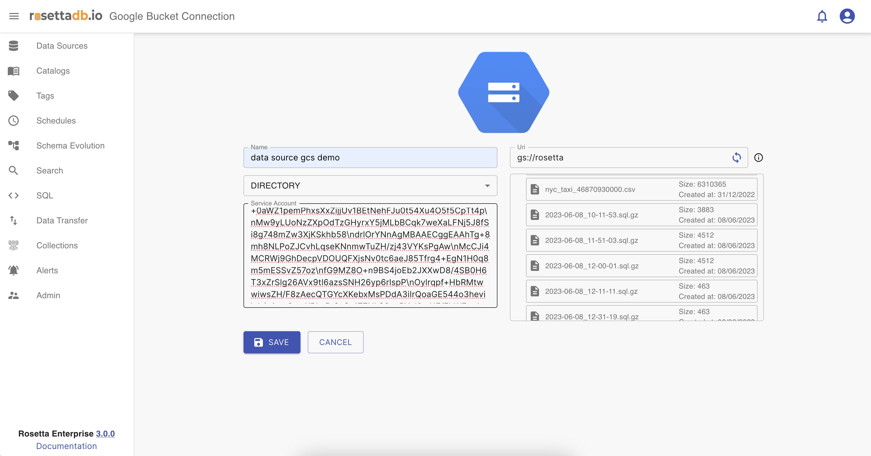 If the user chooses Google Bucket connection type the user needs to fill in a name, choose a type, a directory, CSV, Avro, or parquet, write the service account key, and fill in the URI of the file starting with gs://. The user can explore what files are inside the bucket by clicking on Explore, even without filling the URI . If it clicks on one of the files or directories of that bucket, the URI will be filled or rewritten automatically.
