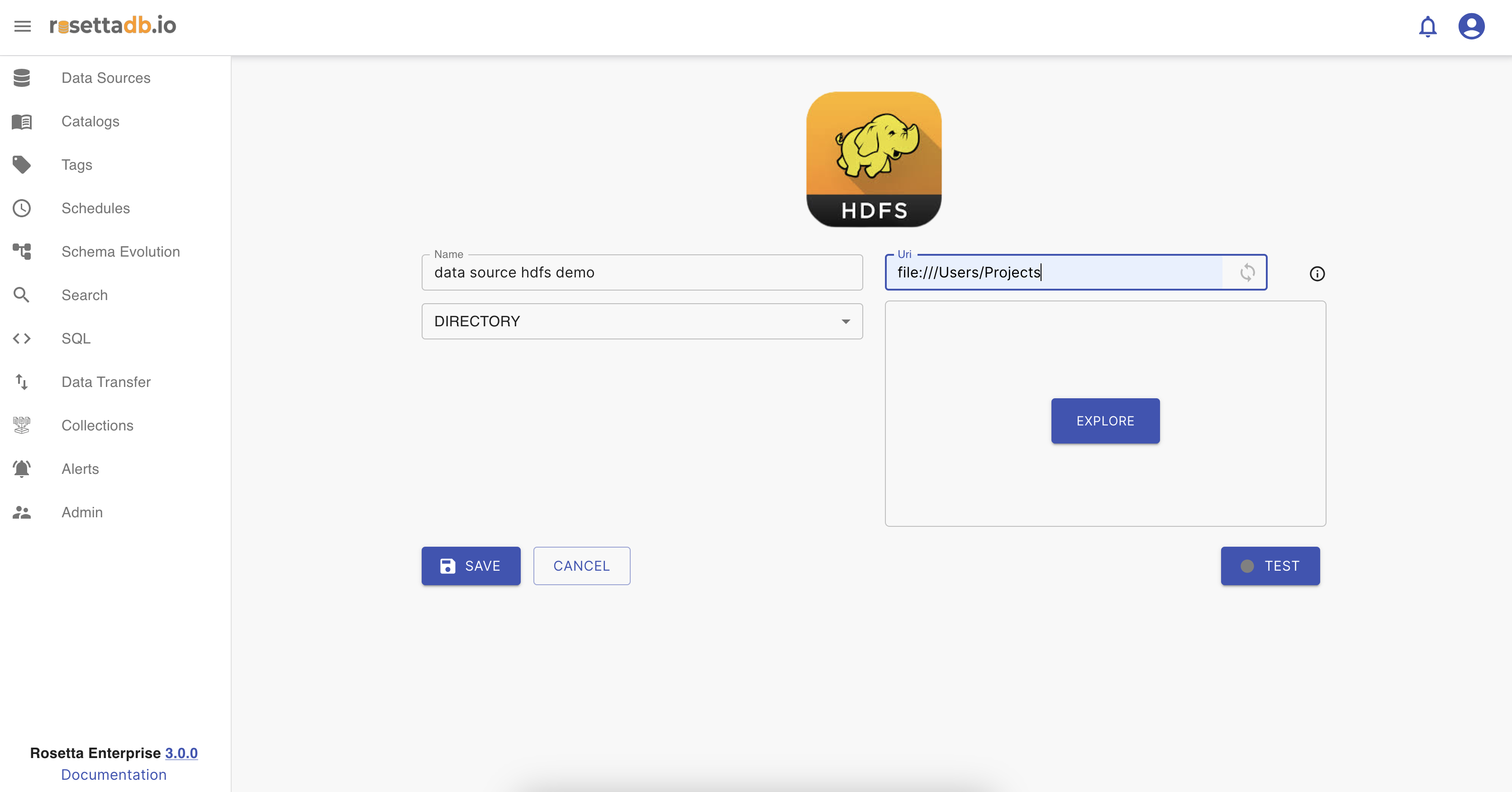 If the user chooses HDFS connection type it needs to fill in a name, choose a type, a directory, CSV, Avro, or parquet, and fill in the URI of the file starting with file://. In order to explore what files are inside the directory by clicking on Explore the user must specify the URI. If it clicks on one of the files in that directory, the URI will be reswritten automatically.
