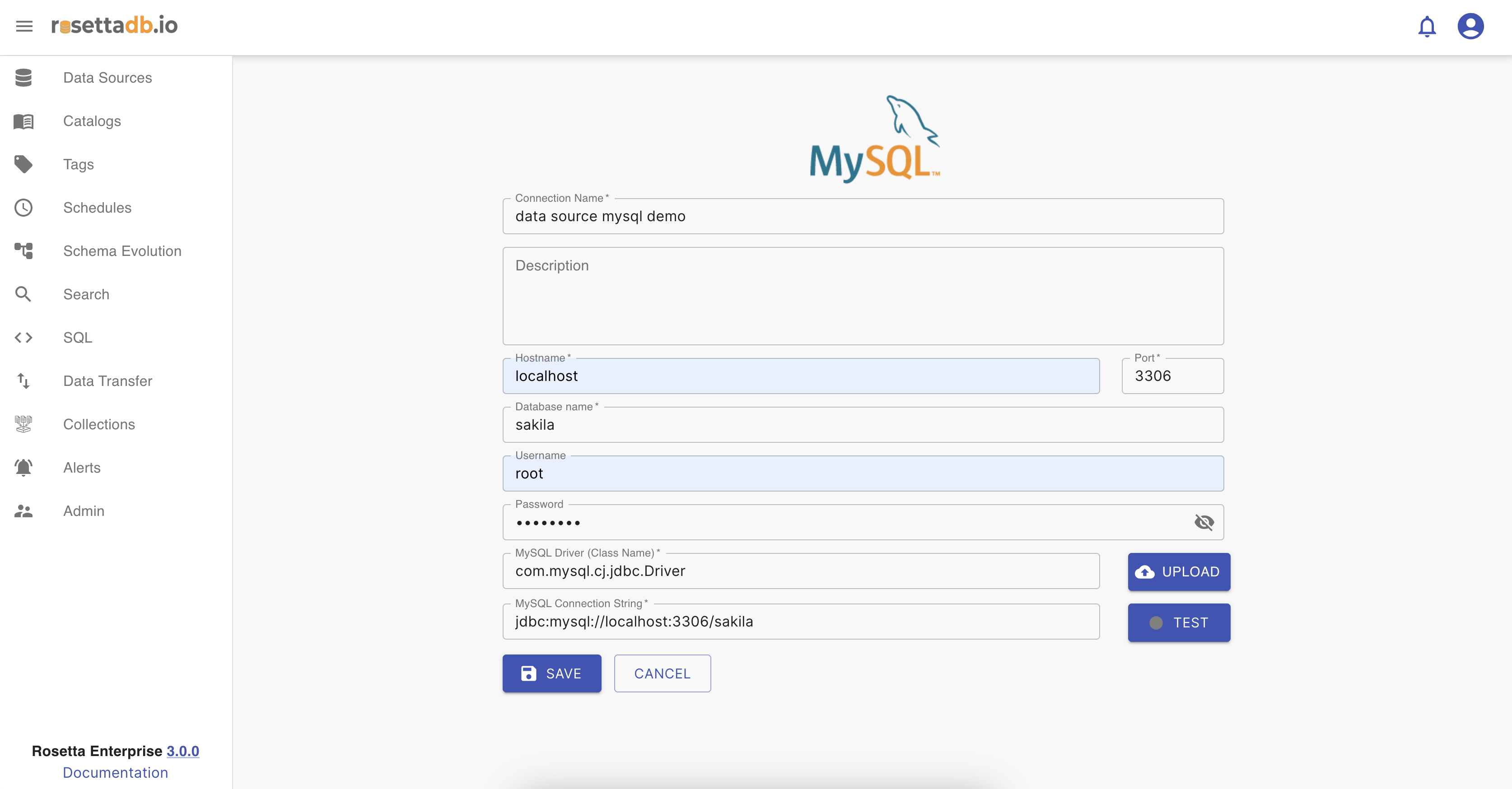 If the user chooses MySQL connection type, must fill in some fields such as a connection name that should be unique, a description, hostname, and port, configured username and password for the data source, the driver should be uploaded and the connection string should be given in a format jdbc:mysql://${host}:${port}.