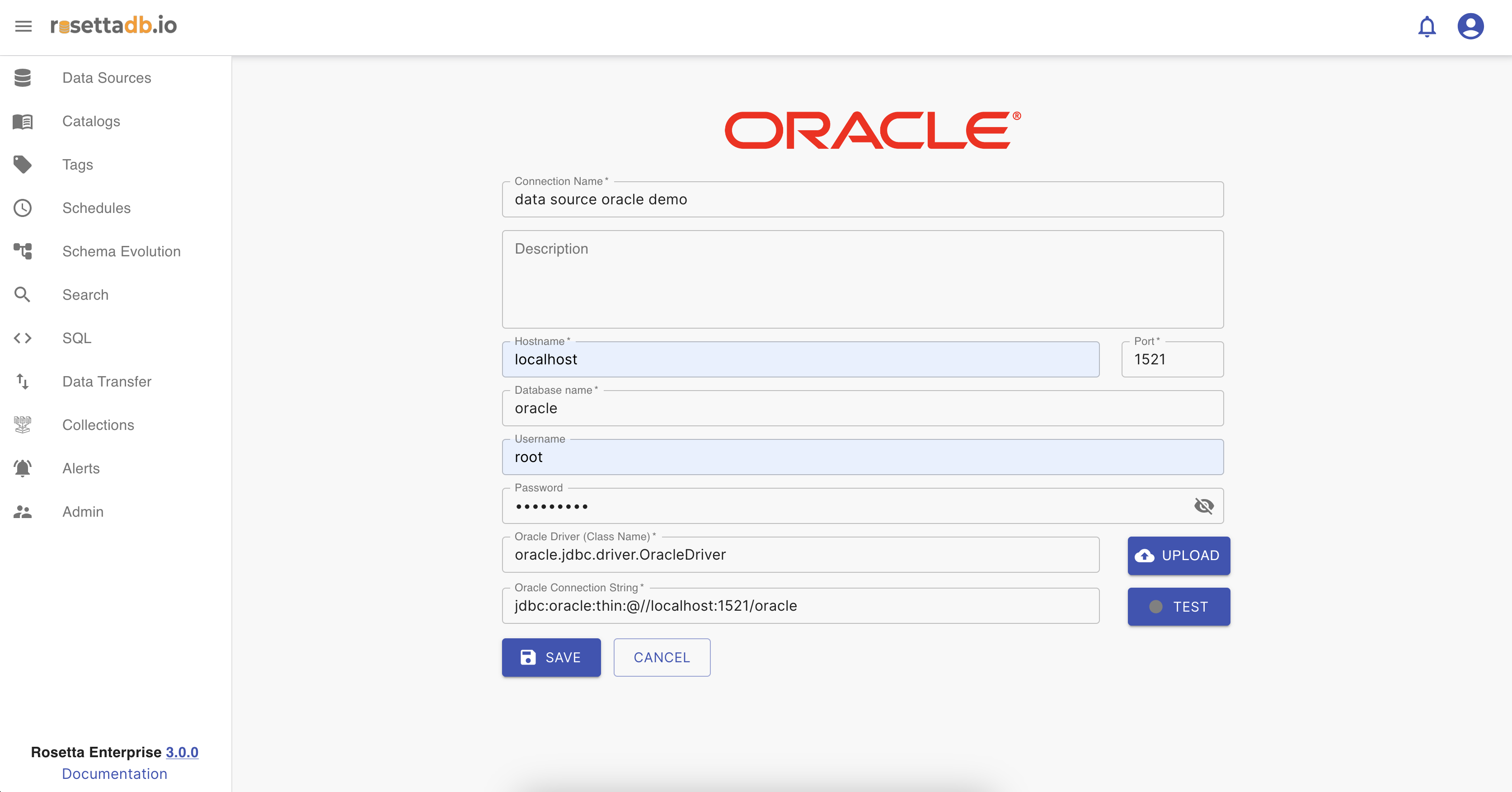If the user chooses Oracle connection type, must fill in some fields such as a connection name that should be unique, a description, hostname, and port, configured username and password for the data source, the driver should be uploaded and JDBC connection string should be given in a format jdbc:oracle:thin:@//${host}:${port}.