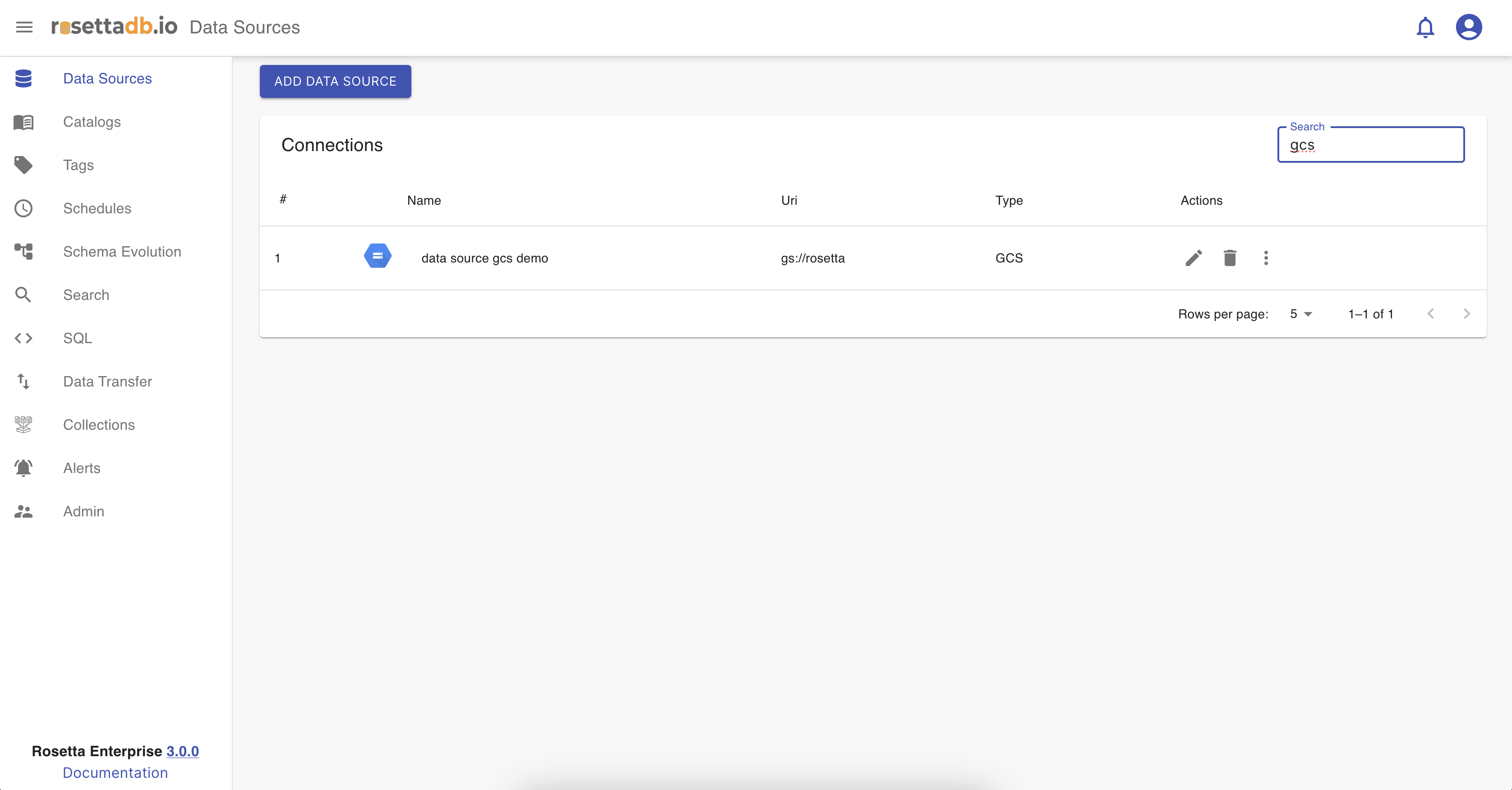 The user can search for a data source from the list of data sources. The data source that we created as an example is named data source demo, so if the user searches for test there will be no results.