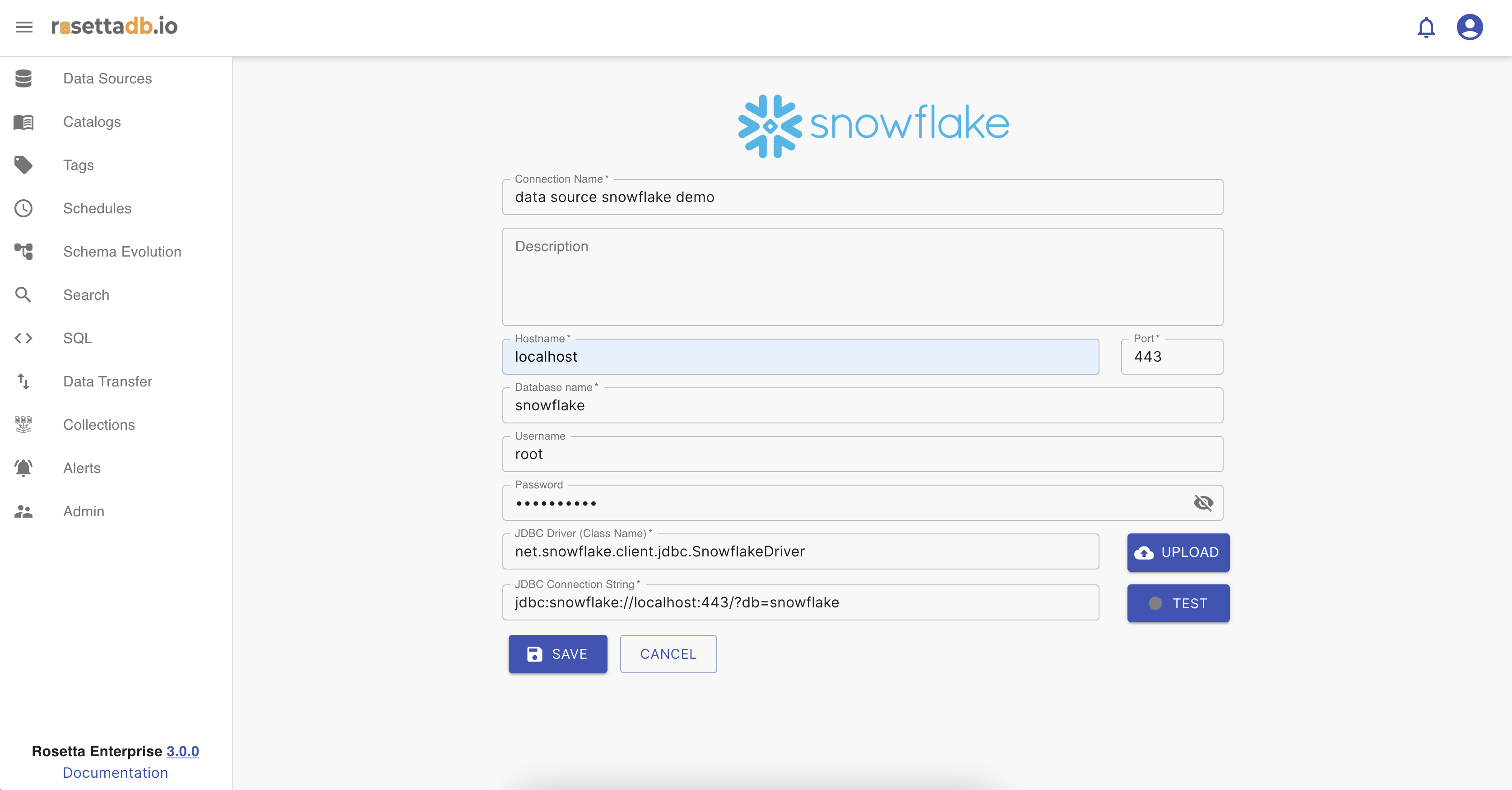 If the user chooses Snowflake connection type, must fill in some fields such as the connection name that should be unique, a description, hostname, and port, configured username and password for the data source, the driver should be uploaded and JDBC connection string should be given in a format jdbc:snowflake://${host}:${port}/db=dbname.
