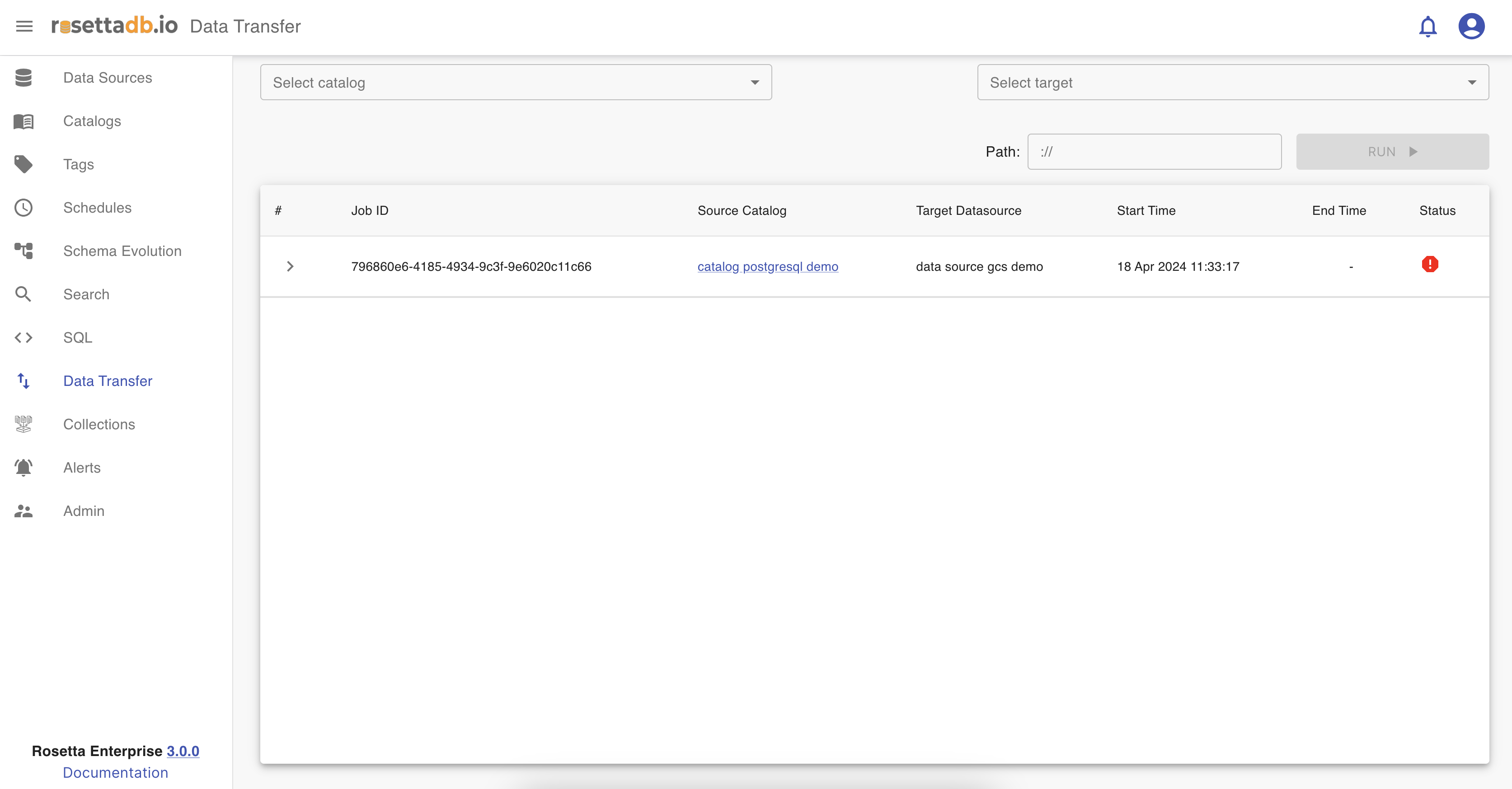 To start a data transfer, users must select a catalog from which they want to transfer data to a chosen target, which can be either a GCS or S3 bucket. Additionally, users need to specify the path where this transfer will be located.