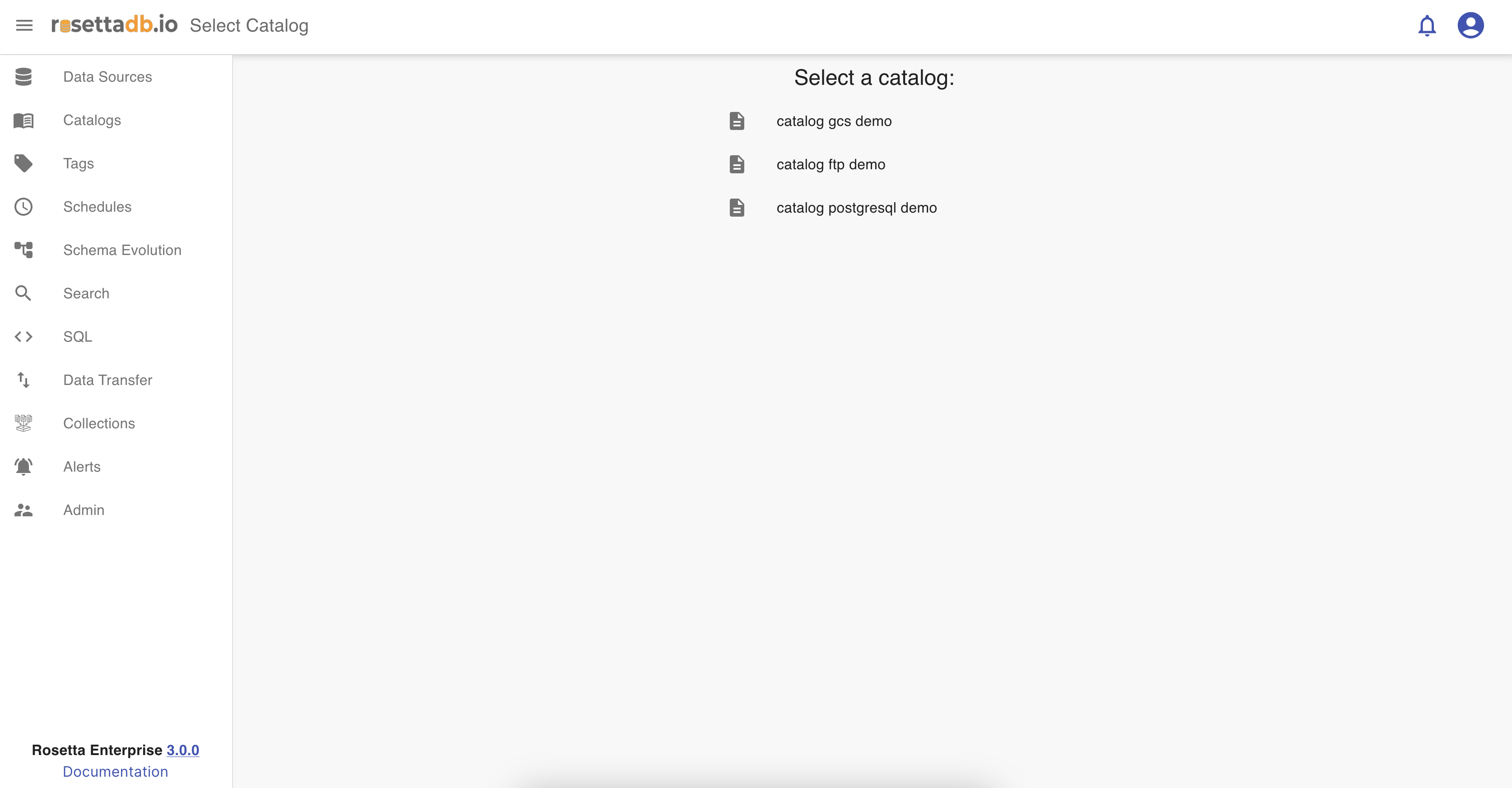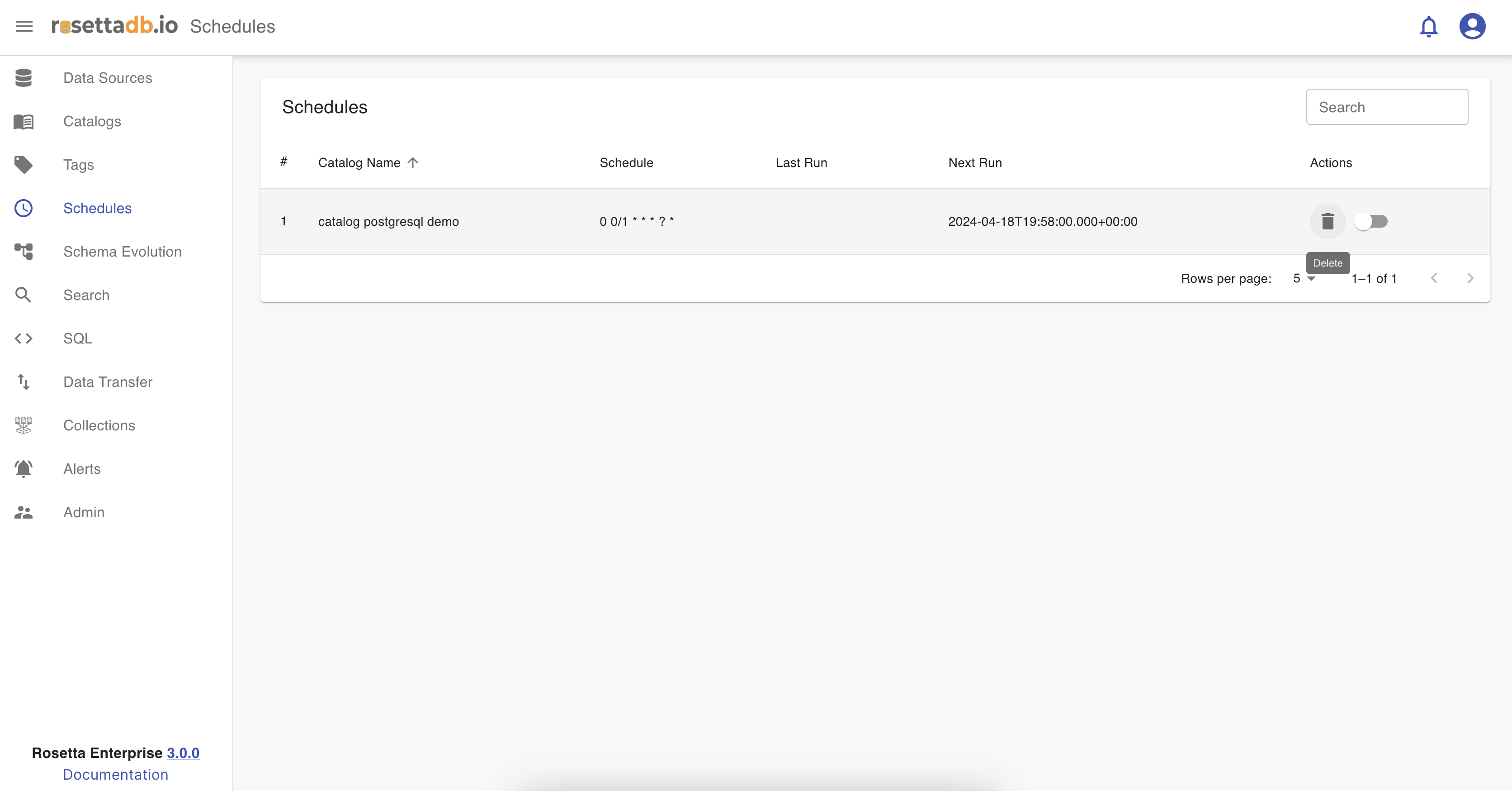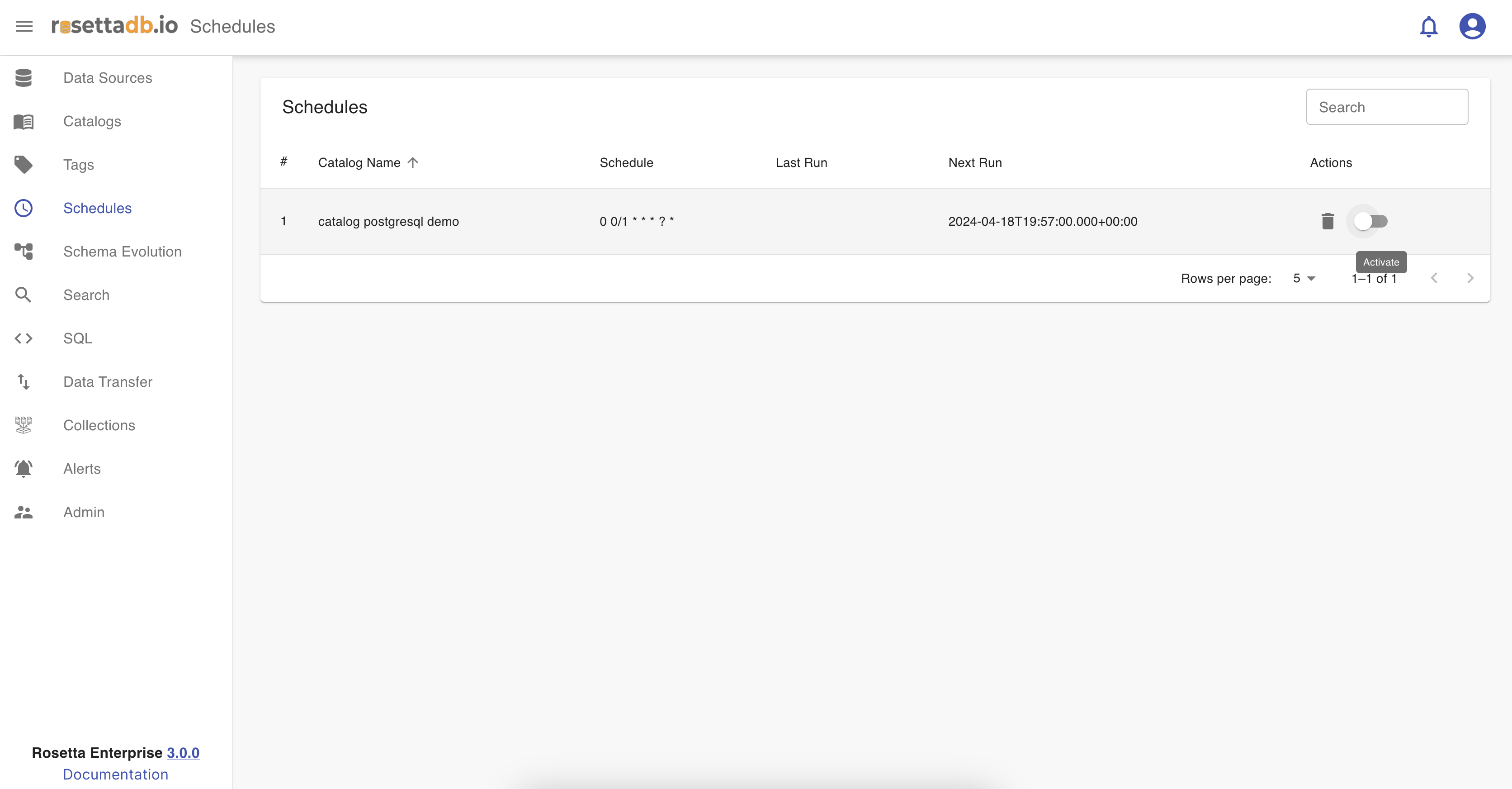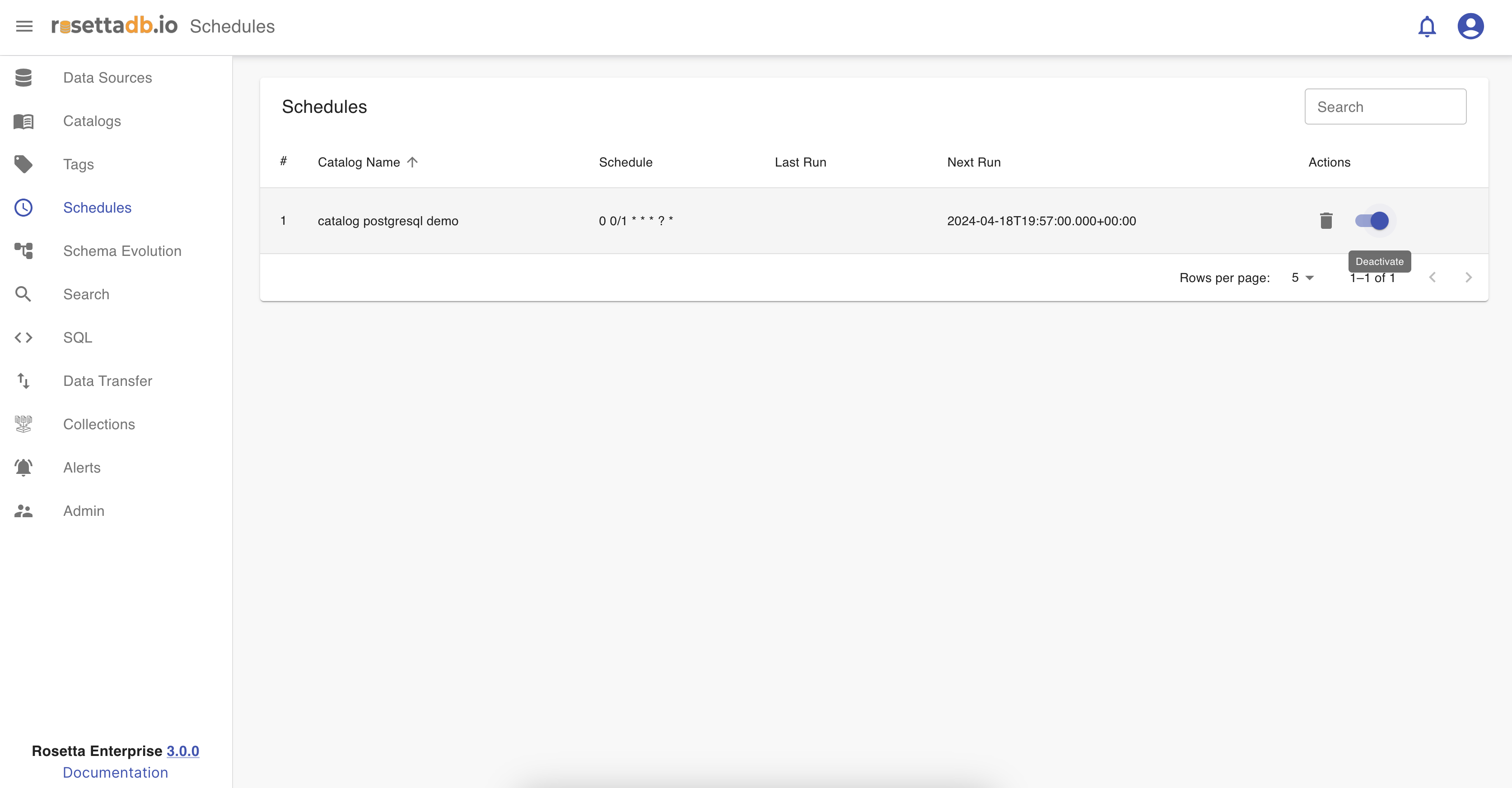 Once the user schedules a run for a catalog, in the Catalogs tab, it is listed in the Schedules category. The list of schedules has information like the catalog name, schedule, last run and next run. It also has the possibility to delete and activate or deactivate a schedule.