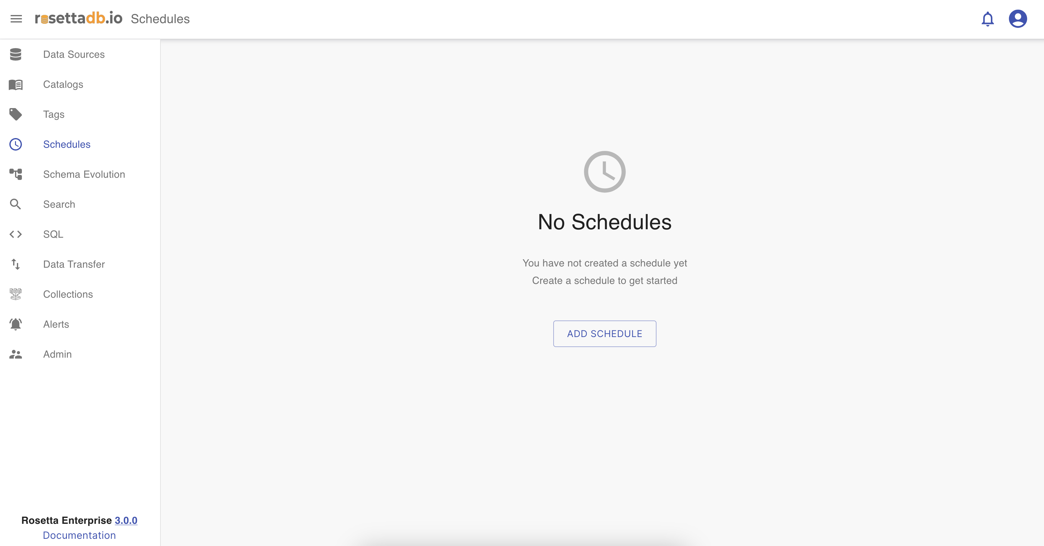 If there are no schedules created, the user clicks on Add Schedule button to add a new schedule, and select a catalog from the list which redirects the user to the Scheduke tab of the chosen catalog to set a schedule.