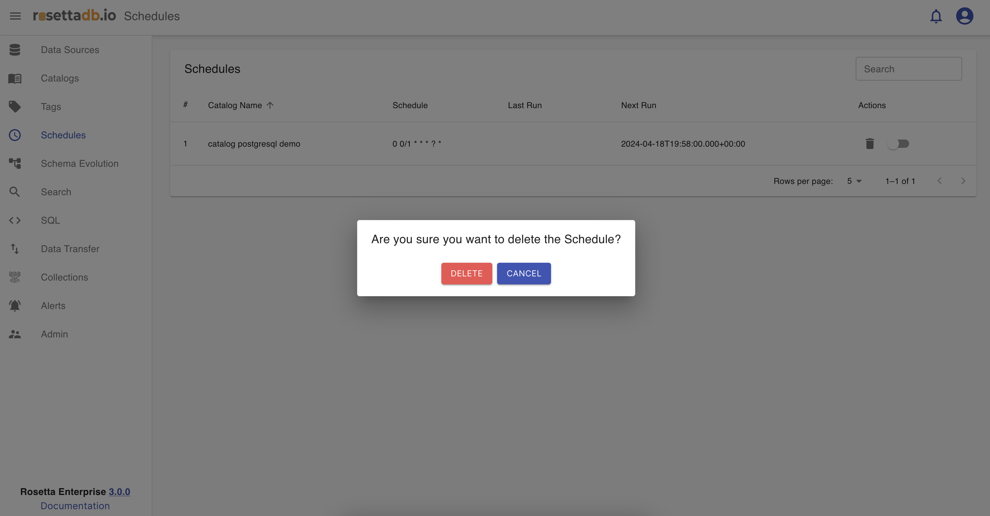 The deletion of a scheduled catalog run is done by clicking on the bin icon.